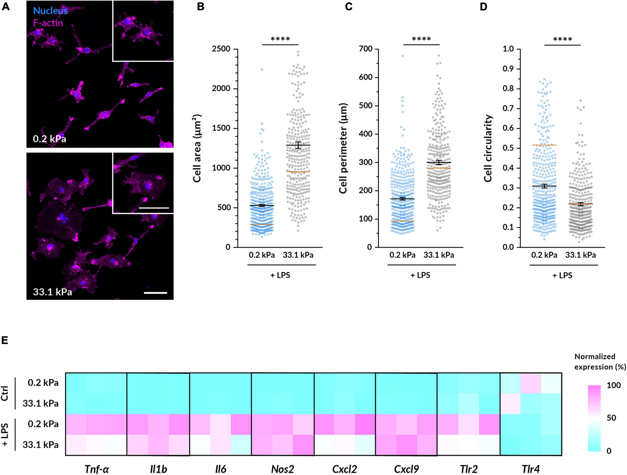 To study their pro-inflammatory response, we primed the BMDMs with lipopolysaccharide (LPS), a molecule present in the wall of gram-negative bacteria. LPS activates toll-like receptors (TLRs) present in the macrophage cell membrane and triggers downstream signaling cascades that promote the transcription of pro-inflammatory genes. We first assessed whether the morphological differences caused by varying substrate stiffness persisted after macrophage priming. After treatment with LPS for 4.5 h, we observed similar relative differences between the compliant and stiff conditions as in the non-primed macrophages (Figures 2A–D). Nevertheless, when compared to unstimulated, LPS-primed cells became larger on both substrates. On 0.2 kPa gels, LPS-treated macrophages had an 83% larger area, an 85% longer perimeter and a 40% lower circularity compared to untreated controls. On 33.1 kPa stiff substrates, they were only 38% more spread, had an 8% longer perimeter but similar circularity. The LPS-induced increase in spreading area and perimeter and the decrease in circularity were more notable in the cells cultured on the compliant than on the stiffer substrate. As previously reported (Jain and Vogel, 2018), LPS tends to promote cell spreading and, since macrophages were already well spread on the stiff gels before their priming, it seems logical that we detected more pronounced changes in the 0.2 kPa gels.
