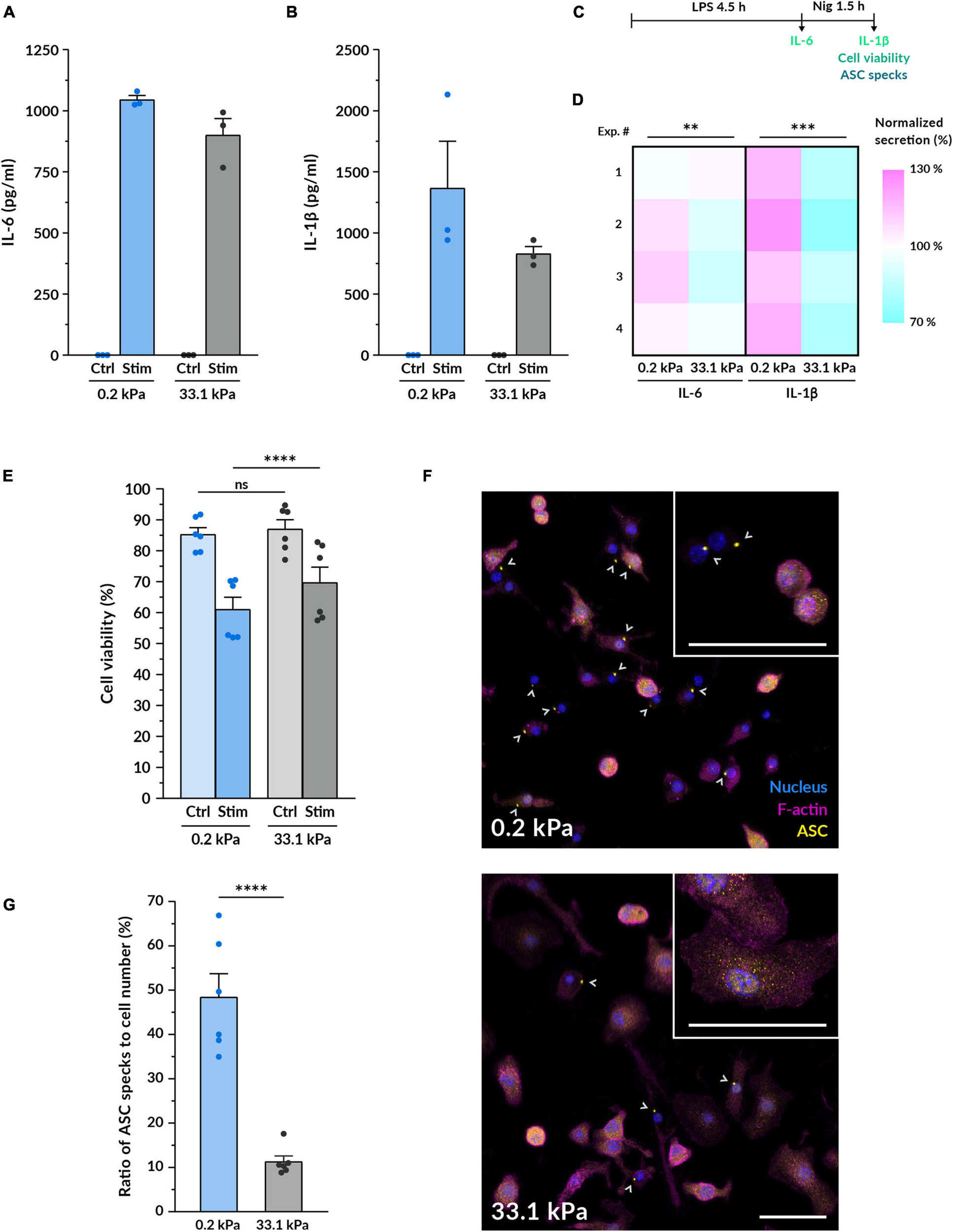 Macrophage pro-inflammatory response is upregulated by more compliant substrates. (A,B) Quantification of the protein levels of the cytokines IL-6 (A) and IL-1β (B) secreted by macrophages on compliant and stiff polyacrylamide hydrogels via ELISA. BMDMs were cultured for 14–18 h on the hydrogels, primed with 100 ng/ml LPS for 4.5 h and stimulated with 10 μM nigericin for 1.5 h. IL-6 supernatants were collected after LPS priming, for IL-1β after nigericin treatment. Results of one representative experiment are shown (mean ± SEM), each dot represents one replicate. All experiments were independently repeated three times using cells from three different mice and with similar results. (C) Scheme of the experimental treatment applied in (A–G). (D) Heatmap of the IL-6 and IL-1β cytokine quantification performed as described in (A,B). Each square represents an independent experiment. Statistical analysis was performed using a 1D linear mixed model and p-values were determined by a likelihood ratio test. ∗∗∗p < 0.001. (E) Assessment of cell viability after macrophage priming and stimulation. Cell viability was determined by LDH assay for untreated control BMDMs cultured on gels and for macrophages treated as described in (A,B). Mean ± SEM are shown and each dot represents a replicate obtained from three independent experiments. Statistical analysis was performed using a 1D linear mixed model and p-values were determined by a likelihood ratio test. ∗∗∗p < 0.001. (F) Representative confocal microscopy images of fluorescent ASC specks as a measure of inflammasome formation. BMDMs cultured on the different gels for 14–18 h, primed and stimulated as in (A,B). Nuclei shown in blue, F-actin in magenta and the inflammasome linker protein ASC in yellow. Gray arrowheads indicate ASC specks, markers of inflammasome assembly. Insets display higher magnification examples of cells on each stiffness. Scale bars, 50 μm. (G) Quantification of the ratio of ASC specks to cell number. Mean ± SEM are shown and each dot indicates one of the different replicates obtained from three independent experiments. The total number of cells analyzed was 4327 (compliant hydrogels) and 5030 (stiff hydrogels). Statistical analysis was performed using a 1D linear mixed model and p-values were determined by a likelihood ratio test. ns, not significant, **p < 0.01, ***p < 0.001, ****p < 0.0001.