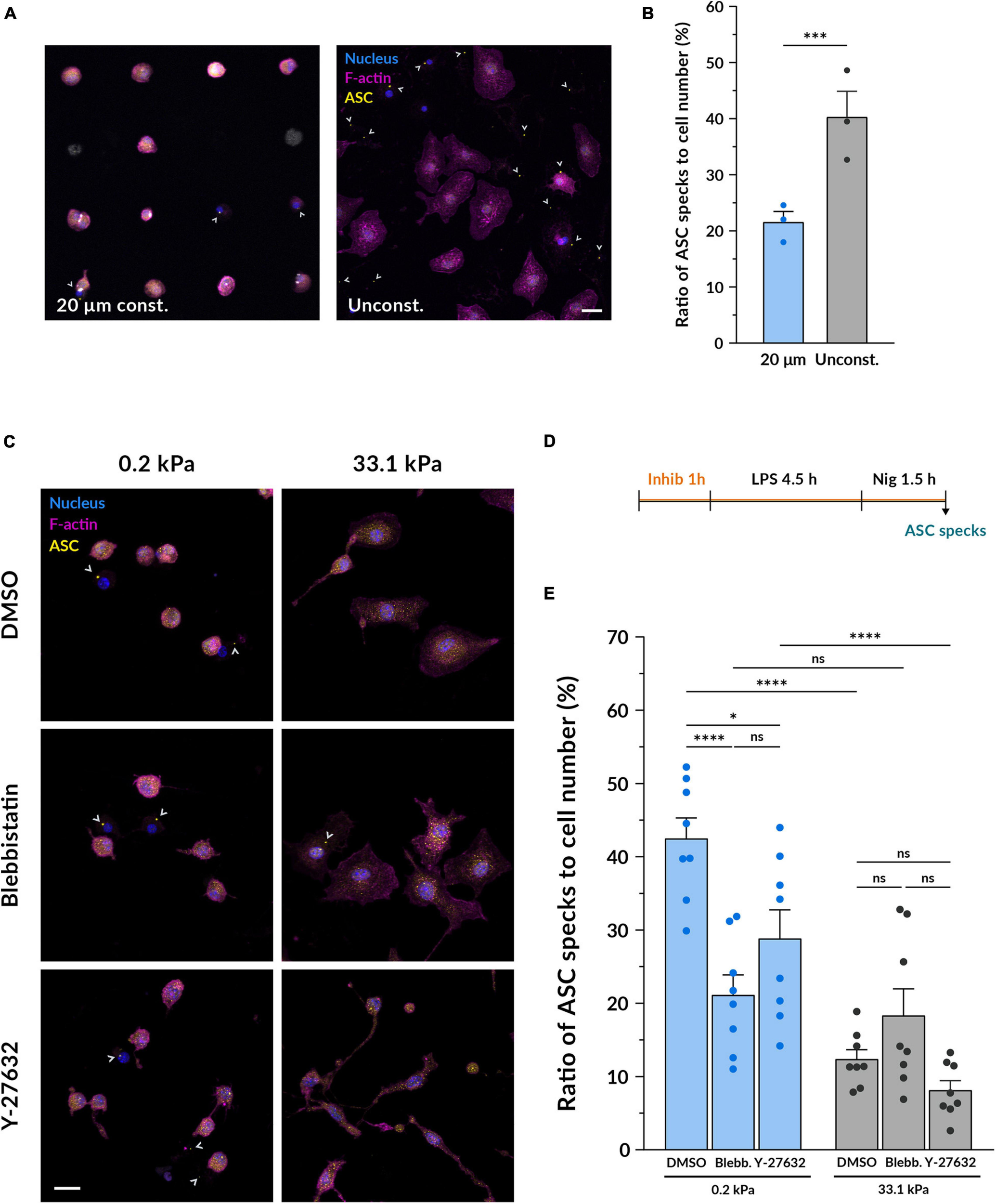 Inhibiting myosin but not limiting cell spreading diminishes the differences induced by stiffness on inflammasome formation. (A) Representative confocal microscopy images of inflammasome formation under cell confinement. BMDMs were cultured on fibronectin-coated circular islands micropatterned on a glass substrate with a diameter of 20 μm. Unconfined cells were grown on fibronectin-coated glass coverslips growing in an unconfined manner. After 14–18 h of culture, they were primed with 100 ng/ml LPS for 4.5 h and stimulated with 10 μM nigericin for 1.5 h. Nuclei shown in blue, F-actin in magenta and ASC in yellow. Scale bar, 20 μm. (B) Quantification of the ratio of ASC specks to cell number. Mean ± SEM are shown and each dot indicates an independent experiment done with BMDMs from different mice. The total number of cells analyzed was 1560 for the 20 μm confined and 1524 for the unconfined adhesion area. Statistical analysis was performed using a 1D linear mixed model and p-values were determined by a likelihood ratio test. * * **p < 0.0001. (C) Representative confocal microscopy images of inflammasome formation under actomyosin inhibition. BMDMs cultured on hydrogels for 14–18 h were pretreated with either 1:1700 DMSO as a control, 10 μM blebbistatin or 10 μM Y-27632 for 1 h. Keeping the respective inhibitor molecules, cells were then primed with 100 ng/ml LPS for 4.5 h and stimulated with 10 μM nigericin for 1.5 h. Nuclei shown in blue, F-actin in magenta and ASC in yellow. Scale bar, 20 μm. (D) Scheme of the experimental treatment applied in (C,E). (E) Quantification of the ratio of ASC specks to cell number. Mean ± SEM are shown and each dot indicates one of the different replicates obtained from three independent experiments. The total number of cells analyzed was, for compliant gels, 4673 (DMSO), 3528 (blebbistatin) and 5182 (Y-27632); and for stiff gels, 4859 (DMSO), 5447 (blebbistatin), and 5214 (Y-27632). Statistical analysis was performed using a one-way ANOVA followed by Bonferroni’s post hoc analysis to obtain the multiple comparison p-values. ns, not significant, *p < 0.05, ***p < 0.001, ****p < 0.0001.