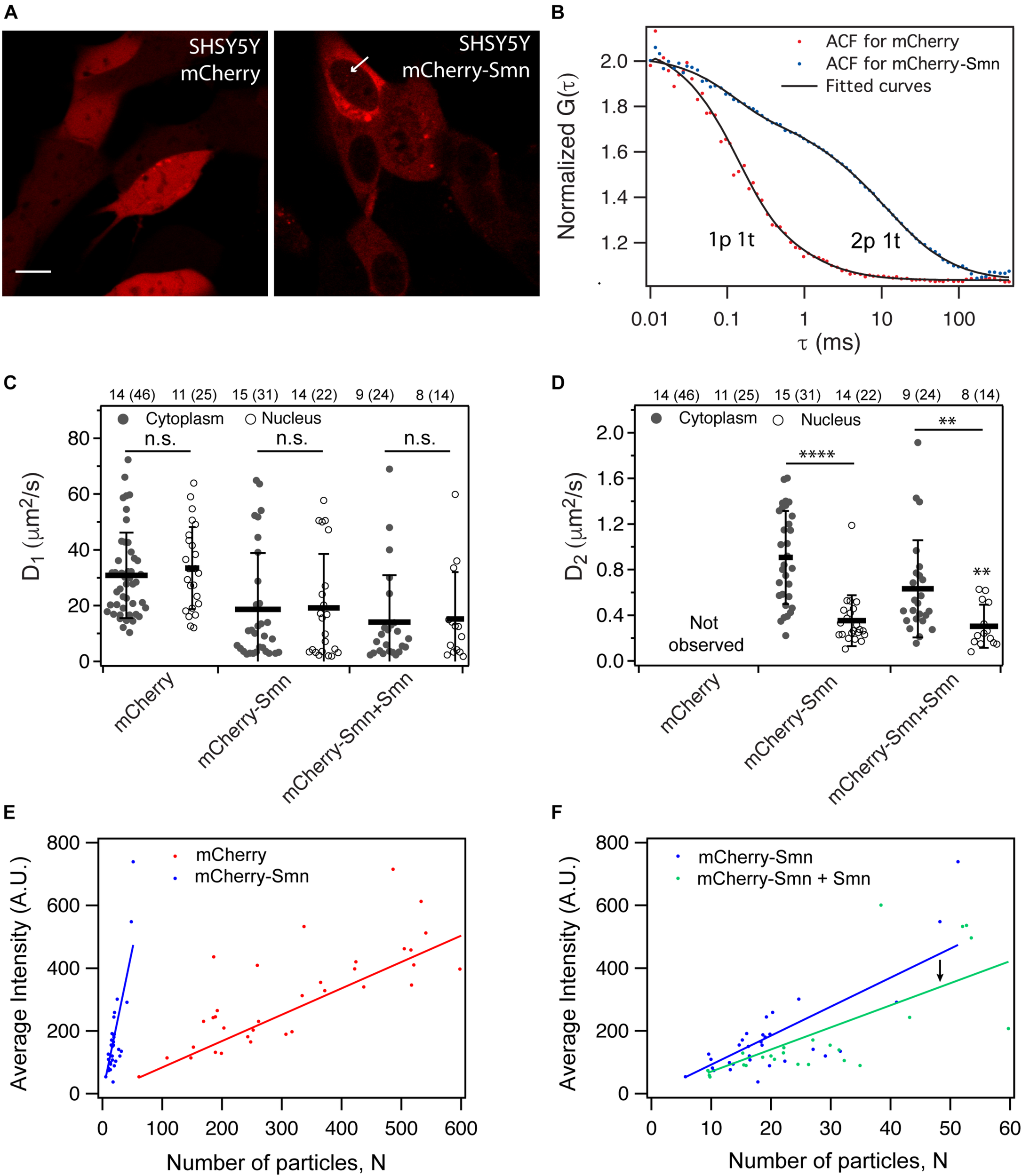 Expression and dynamics of mCherry and mCherry-Smn in SH-SY5Y cell culture. (A) Expression of mCherry and mCherry-Smn in SH-SY5Y cells 2 days after transfection. Scale bar = 10 μm. (B) Representative autocorrelation function (ACF) and fitted ACFs of mCherry and mCherry-Smn in the cytoplasm. ACF for mCherry is fitted to 3D 1p1t while ACF for mCherry-Smn is fitted to 3D 2p1t diffusion model. (C) Mean diffusion coefficients, D1 (μm2/s) in cytoplasm and nucleus for mCherry, mCherry-Smn and mCherry-Smn: Smn (mCherry-Smn co-transfected with untagged Smn). (D) Mean diffusion coefficients, D2 (μm2/s) in cytoplasm and nucleus. Error bars represent the SD. (∗∗P < 0.01, ****P < 0.0001). (E) Brightness analysis of mCherry and mCherry-Smn in cytoplasm by plotting average intensity vs. number of particles. mCherry-Smn particles are brighter than mCherry. (F) Brightness analysis of mCherry-Smn vs. mCherry-Smn with untagged Smn in the cytoplasm. With presence of untagged Smn, brightness of mCherry-Smn goes down. The numbers above the graphs indicate the number of cells (number of points) the measurements were taken in.