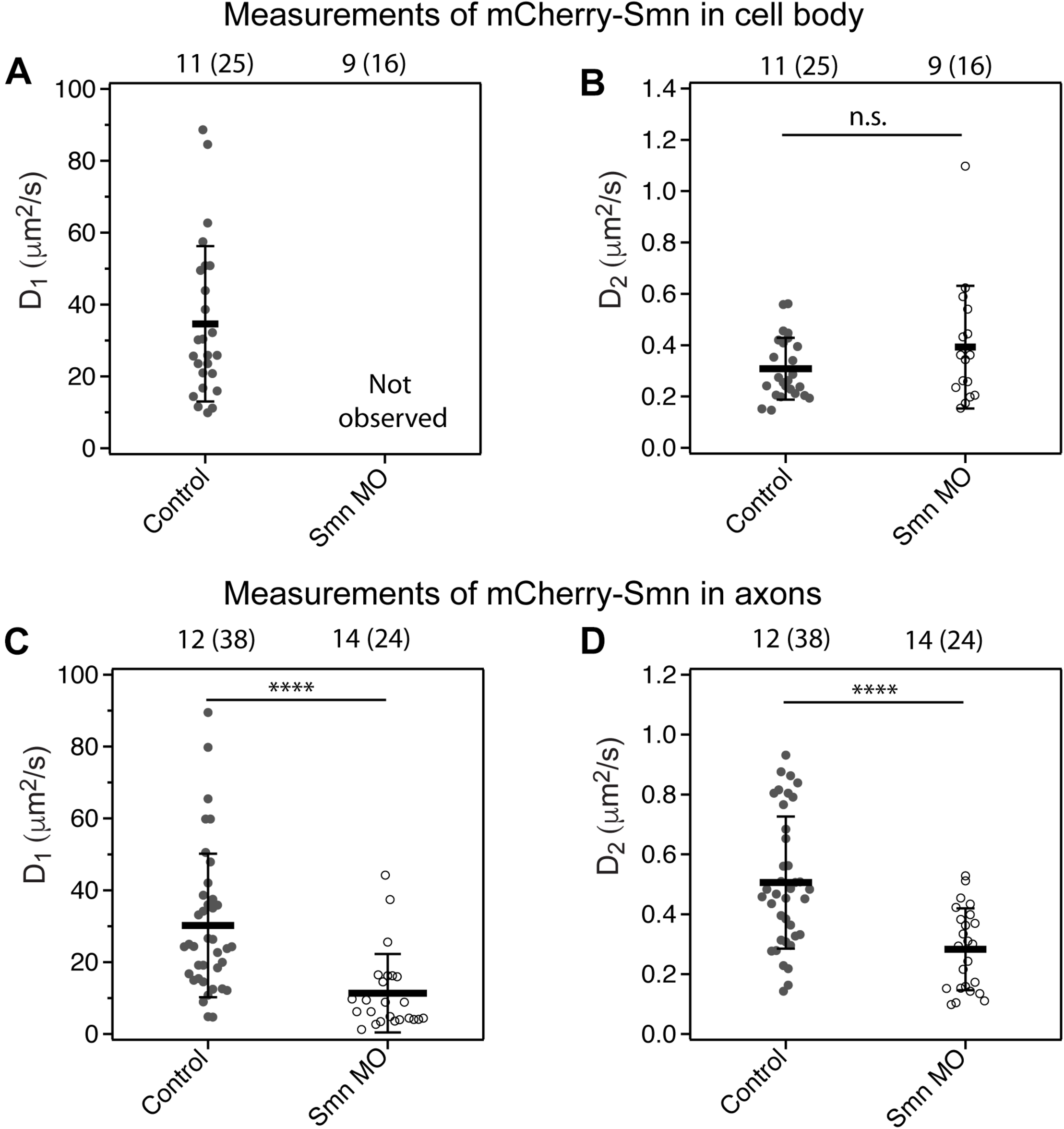 Diffusion coefficient of mCherry-Smn in motor neurons under smn MO conditions. (A,B) Average diffusion coefficients, D1, D2 (μm2/s) of mCherry-Smn in motor neuron cell bodies under uninjected control and smn MO conditions. D1 was not observed for mCherry-Smn under smn MO conditions. (C,D) Average diffusion coefficients, D1, D2 (μm2/s) of mCherry-Smn in axons for uninjected control and smn MO conditions. Error bars represent the SD. (n.s.P > 0.05, ****P < 0.0001). The numbers above the graph indicate the number of fish (number of points) the measurements were taken in.