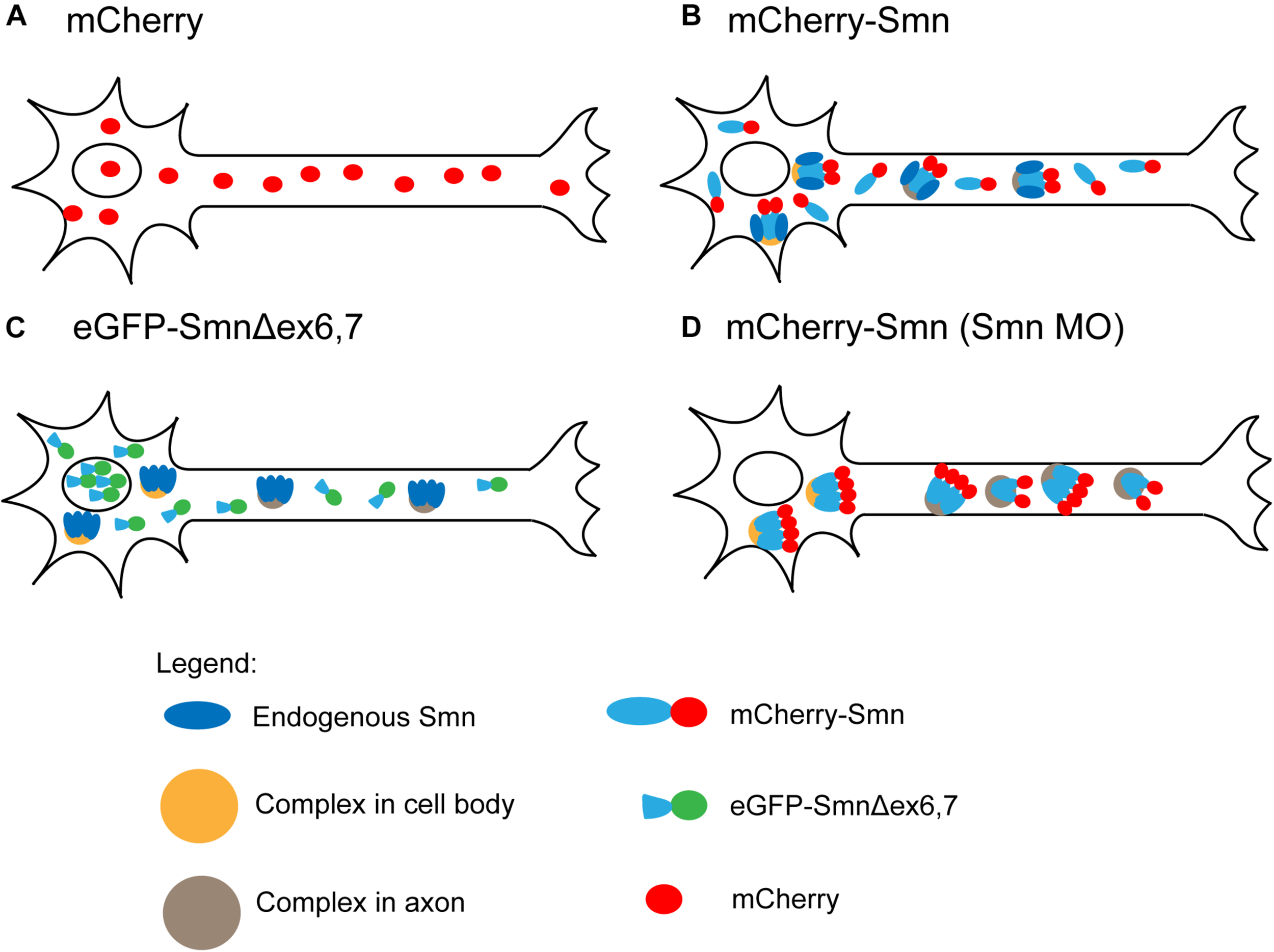 It has been hypothesized that SMN has a motor neuron specific role in axonal transport and controls localization of mRNAs important for axon outgrowth, neuromuscular junction (NMJ) maturation and maintenance (Fallini et al., 2012). However, studies analyzing the subcellular distribution of SMN in motor neurons are scarce. By quantitative analysis of Smn behavior in zebrafish motor neurons using FCS, we intended to provide more insight into its axonal function.