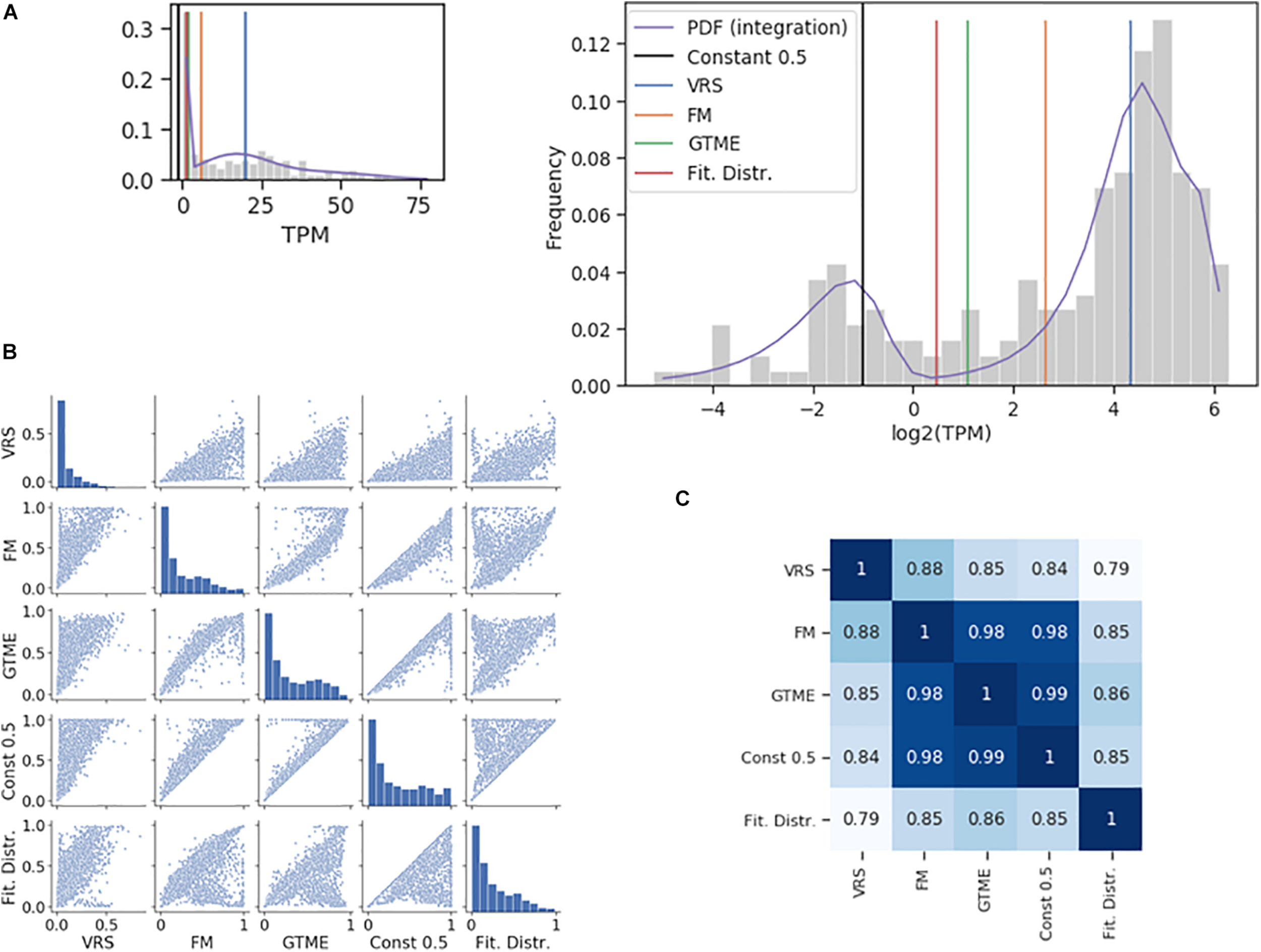 Three methods were compared to dichotomize the expression of individual genes: VRS, FM and GTME. The minimum threshold was set to be 0.5 TPM, which is widely used as threshold for a gene considered to be expressed. Thus, when a procedure resulted in a threshold with a value less than 0.5 TPM, it was replaced by 0.5 TPM. Upon determining the threshold, the genes are dichotomized. If the expression value is greater than or equal to a threshold, the gene is marked as expressed in this cell (i.e., with 1), otherwise it is marked as not expressed (i.e., with 0).