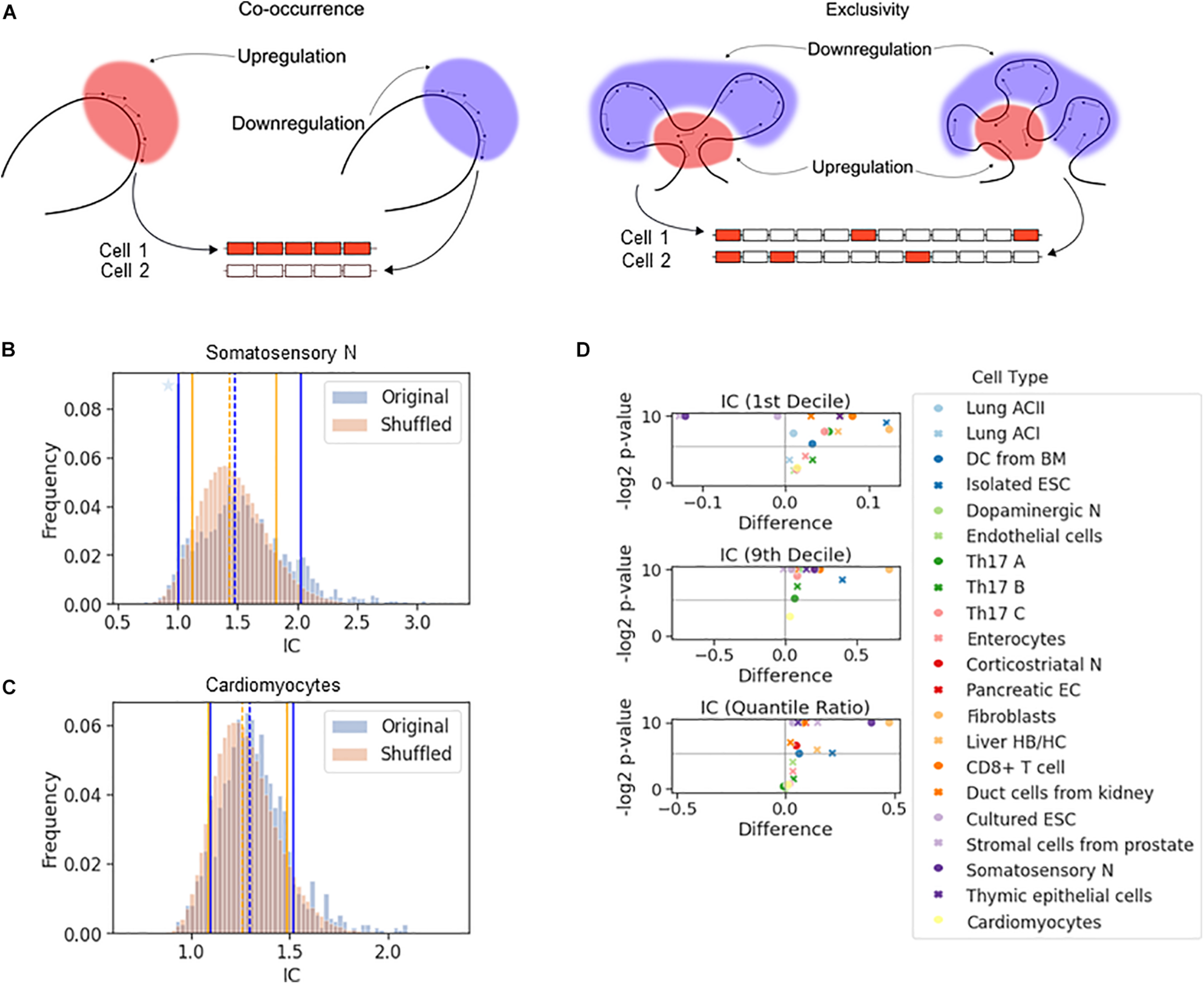 The effect of chromosomal adjacency on stochastic gene choice. (A) Schemes showing examples of how the two major forms of stochastic gene choice, concurrence and exclusivity, can arise from alternative chromosomal configurations. (B,C) The IC distributions calculated from the original and the shuffled genomes of the somatosensory neurons (B) and cardiomyocytes (C). Segmentation size: 14 genes. The blue star denotes a high bar in the histogram hidden by the full line. The location of the 1st (full line), 5th (dashed line) and 9th (full line) deciles is given in the order of original and reshuffled distribution, followed by the P-values for the differences: 1.00, 1.48, 2.02; 1.12, 1.44, 1.82; 0.001, 0.016, 0.001. (B) 1.10, 1.29, 1.52; 1.09, 1.26, 1.49; 0.217, 0.002, 0.137 (C). (D) Volcano plots showing the difference of 1st decile, 9th decile and quantile ratio IC values between the original and the shuffled genomes, along with the corresponding P-values (permutation test, segment size: 14 genes). The gray horizontal line at 0.025 corresponds to a two-tailed significance level of 0.05.