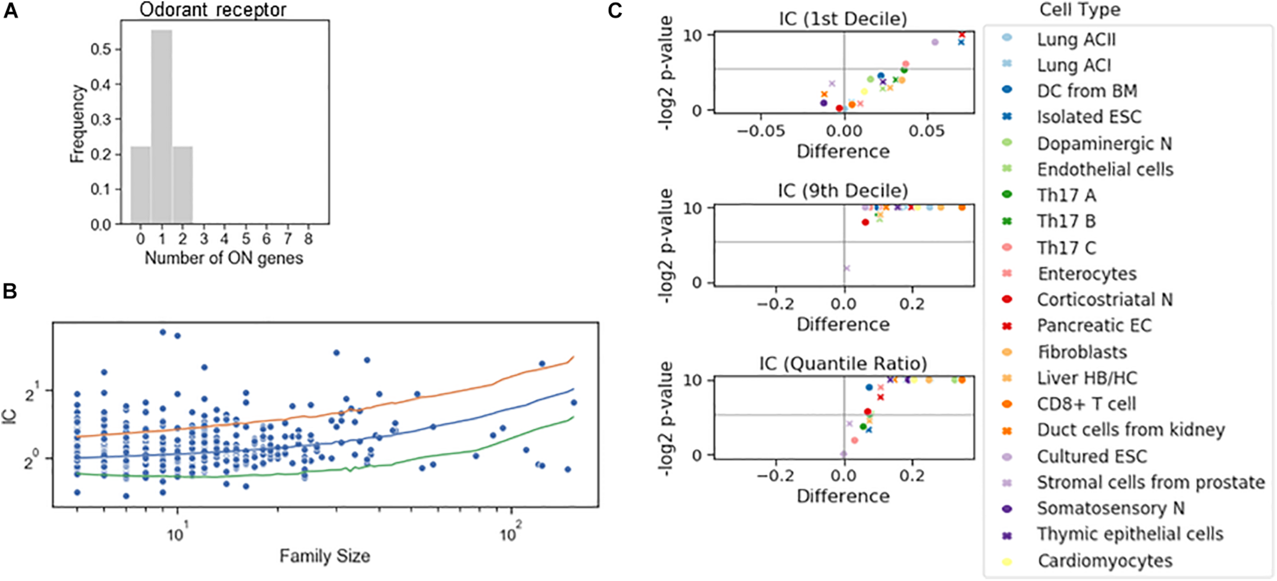 Stochastic interdependence in gene families. (A) The number of expressed genes per cell in the family of odorant receptor genes, dichotomized with the familywise threshold (70.7 TPM). Number of cells is N = 27. (B) IC values of individual families in somatosensory neuron dataset, grouped by the family size. The majority of the families with ICs exceeding either 2.5 or 97.5 IC percentiles of the shuffled genome (orange and green lines, respectively) are concurrent. (C) Volcano plots showing the difference of 1st decile, 9th decile and quantile Ratio IC values between the original and the shuffled genomes, along with the corresponding P-values (permutation test) calculated for the gene families consisting of 7 genes.