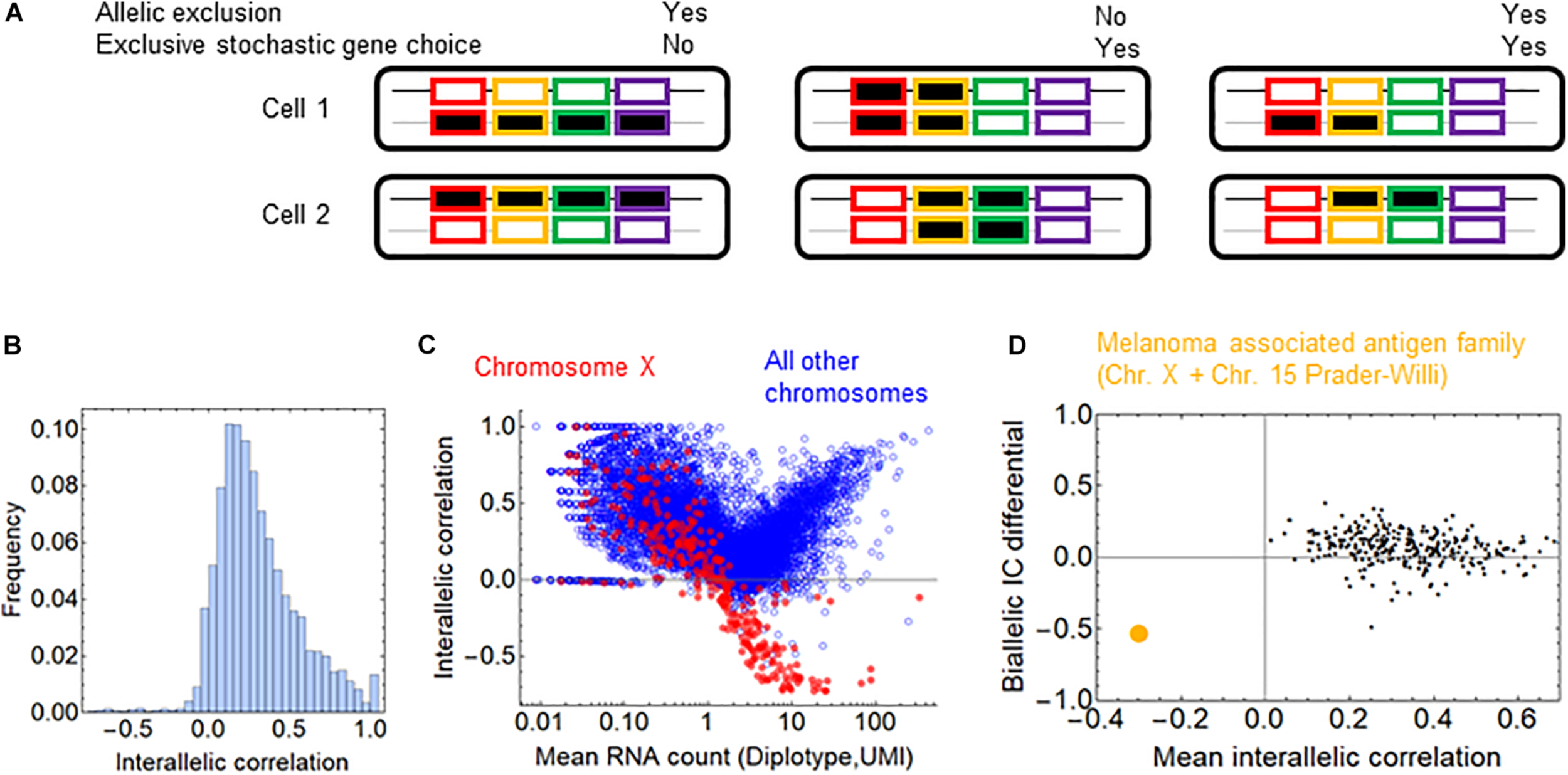 Allelic exclusion and exclusivity in stochastic gene choice. (A) Schematic representation of different combinations of exclusivity in allelic and gene choice in an array of four genes. The black and gray lines represent the maternal and paternal chromosomes. The rectangles with no or black filling represent the OFF and ON expression states, respectively (B) The interallelic correlation in fibroblasts (Larsson et al., 2019). Negative correlations indicate the allelic exclusion. (C) The relation between RNA count and interallelic correlation. The genes on the chromosome X are shown in red. (D) The melanoma-associated antigen gene family is highlighted in orange among the gene families. It is the only family with negative mean interallelic correlation.