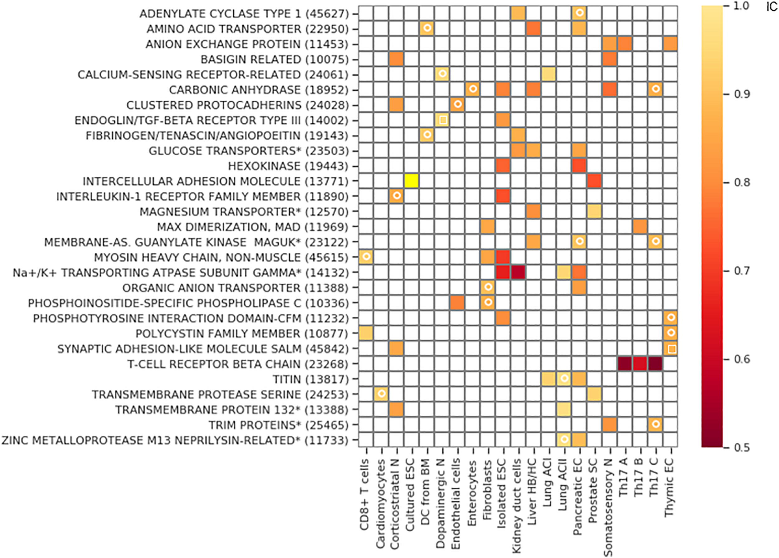 Gene families with exclusive gene choice. Gene families with stochastic exclusive gene choice in two or more cell types; further details of selection as in Supplementary Figure 5 (see also Supplementary Data 1). For the families labeled with star, descriptive names were given instead of the Panther names. The Panther numbers of the families are indicated in parenthesis. The white circle denotes segments with an IC numerically less than 1 without reaching significance. The white empty squares indicates the families that lose exclusivity after truncation of the cell population at the 10th percentile of the total number of detected genes per cell.