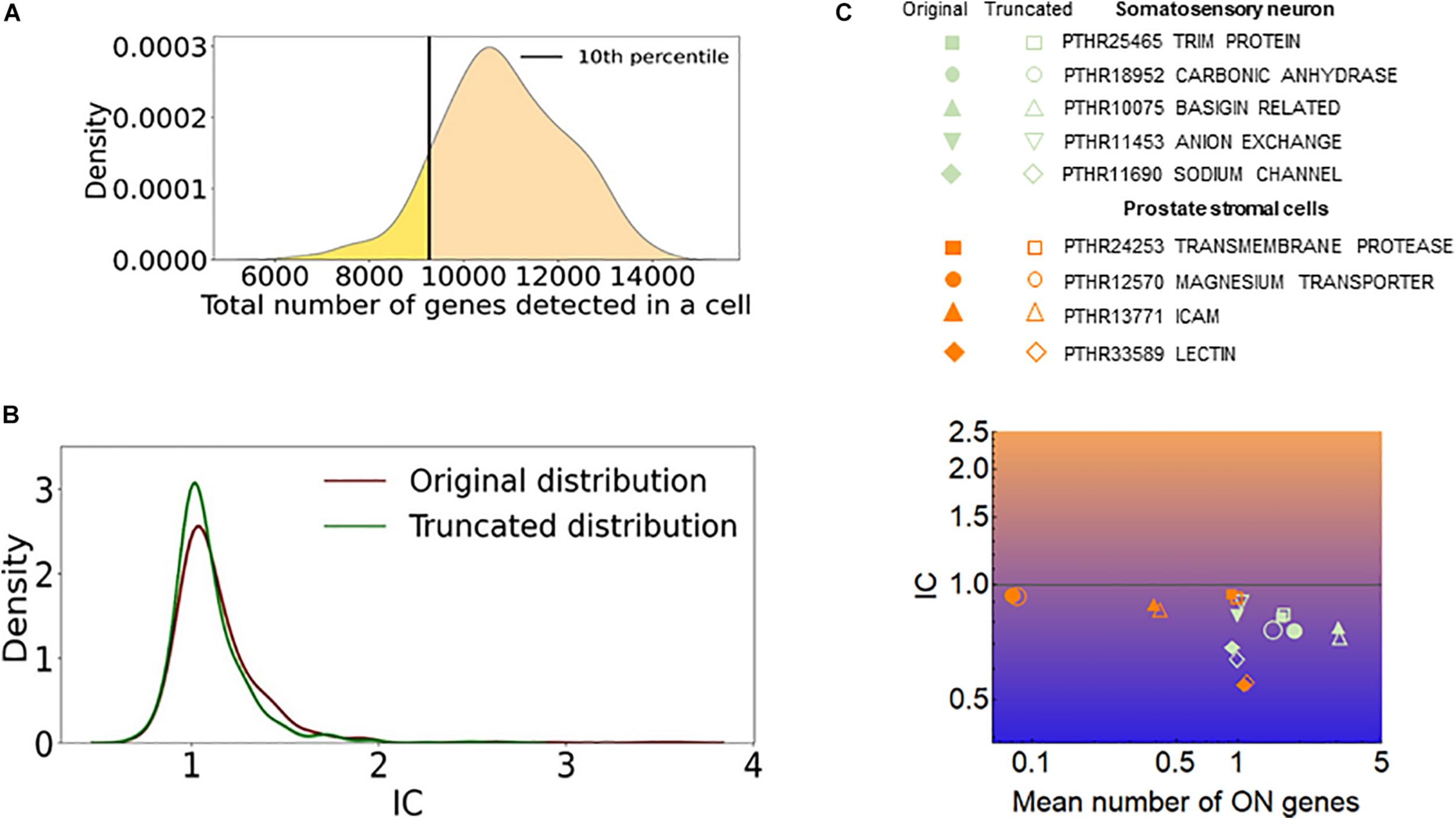 The effect of cells with low number of detected genes on the IC. (A) The distribution of the total number of detected genes per cell (dgpc) in the somatosensory neuron dataset. The black line indicates the dgpc below which the cells were removed to obtain the truncated distribution. (B) The distribution of IC values of gene families calculated from the original and truncated cell populations shown in (A). (C) The IC and the mean number of ON genes calculated with the original (full) and the truncated (empty) datasets. The prostate stromal cell and the somatosensory neuron datasets were used.