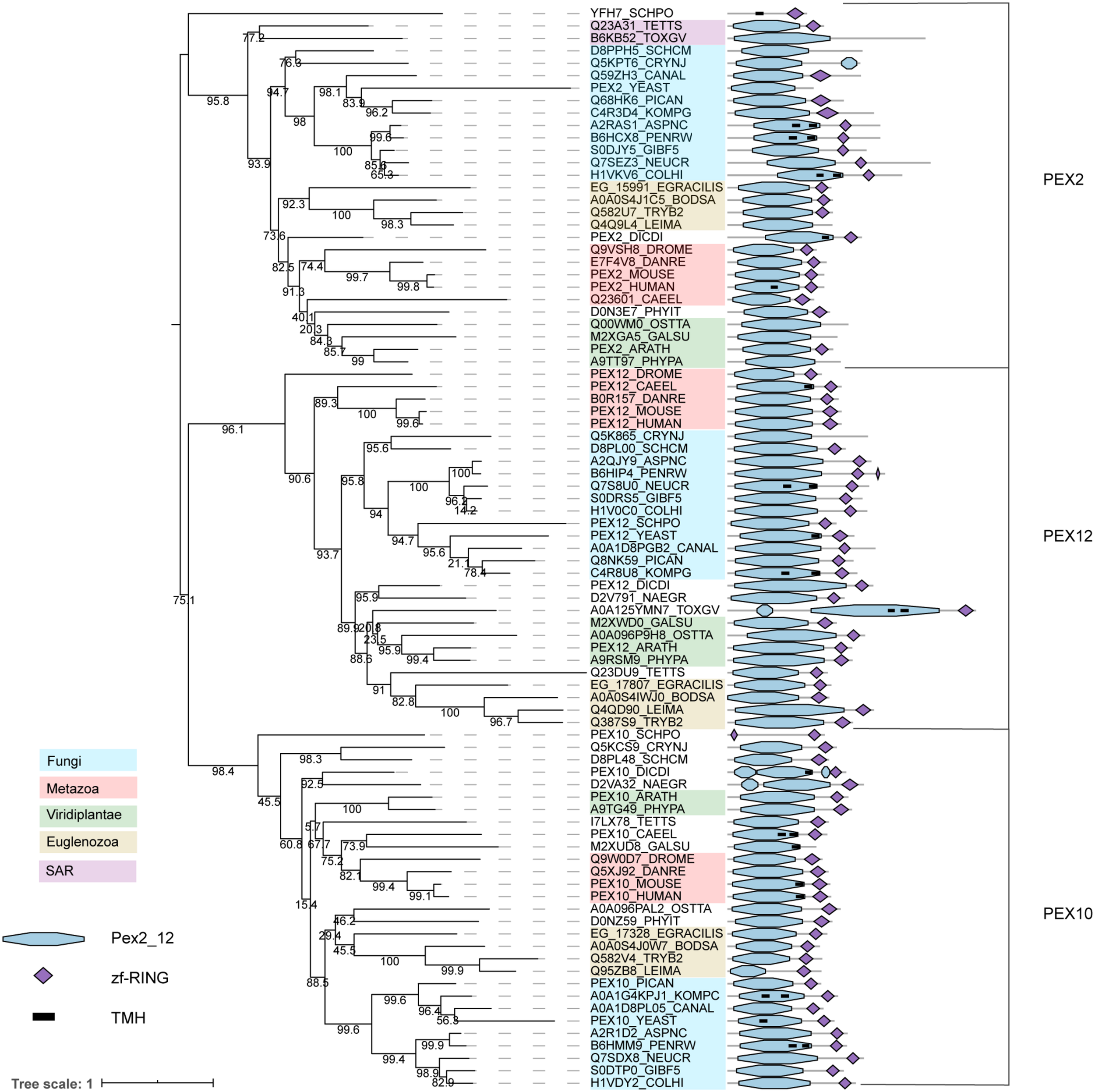 Previous comparative genomics studies on peroxisomes have shed light on the origin of peroxisomes (Gabaldón et al., 2006; Schlüter et al., 2006) and their absence in some species, mostly parasitic protists (Žárský and Tachezy, 2015; Gabaldón et al., 2016; Moog et al., 2017; Mix et al., 2018). However, a comprehensive and up-to-date overview of all PEX proteins was still missing. Here, we present an exhaustive up-to-date overview of all the PEX protein families. We analyzed PEX proteins in a highly diverse set of eukaryotes, including but not limited to model organisms frequently used in cell biology, pathogenic unicellular eukaryotes and higher eukaryotes. Using this information, we combine phylogenetic reconstructions with other protein features (e.g., Pfam domain, protein disorder and transmembrane domain predictions) to understand the evolutionary relationships between these proteins, clarifying certain inconsistencies in the nomenclature of PEX proteins. Important questions that we answer are (i) how are the different PEX genes conserved across eukaryotes, (ii) what is the core set of PEX genes present in the last eukaryotic common ancestor and (iii) what are the typical features of the PEX proteins.