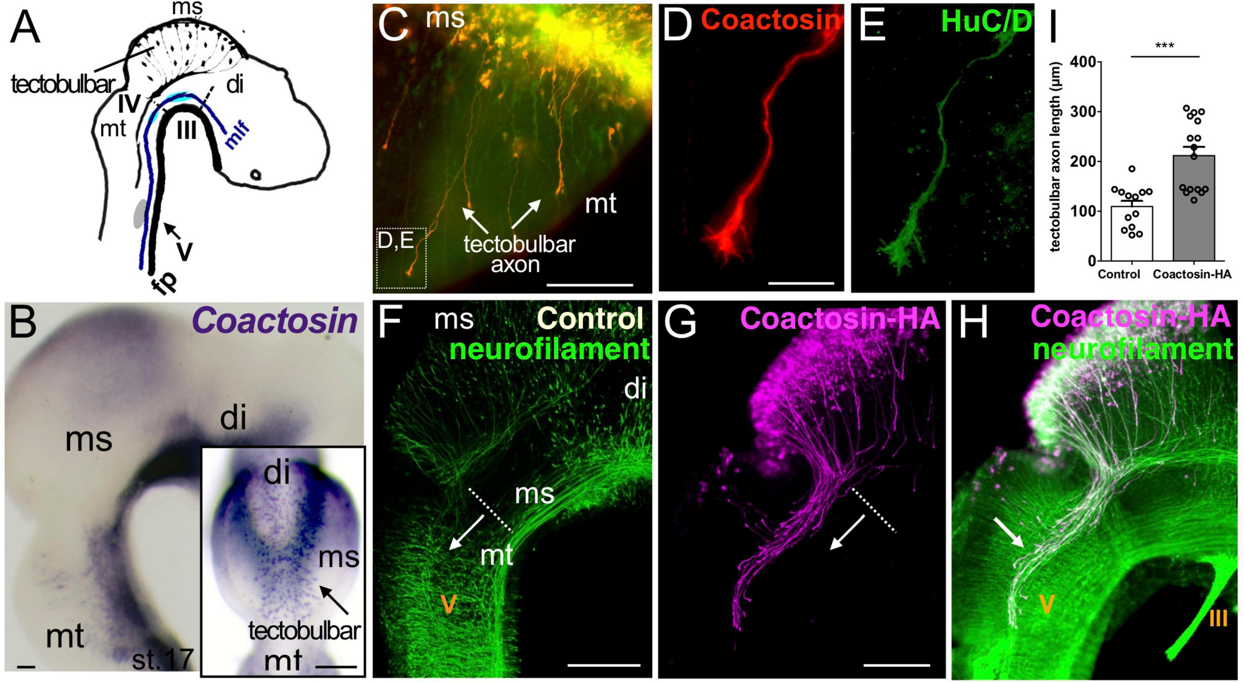 Coactosin localized to growth cones of tectobulbar axons of the midbrain. (A) Schematic representation of axonal tracts in the chick mesencephalon (ms). Tectobulbar neurons project their axons ventrally, turn caudally before reaching the tegmentum, and elongate alongside medial longitudinal fascicule (mlf). (B) Expression of coactosin mRNA in the dorsal midbrain (tectum) in chick embryos at stage 17. Dorsal view (inset) showing the strong spot-like expression around the dorsal midline (arrow, tectobulbar neuron). (C–E) Coactosin (red) and HuC/D (green) proteins within tectobulbar axons in the mid-hindbrain region. Tectobulber axons project ventrally from stage 16 (arrows). Higher magnification showing coactosin and HuC/D distribution in the growth cones (D,E; indicated in C). (F–H) The overexpression of hemagglutinin (HA)-tagged coactosin leads to the premature elongation of tectobulbar axons at the electroporation side (arrow; G,H) when compared with the control side (arrow; F). Double staining with the HA-tag (magenta) and neurofilament (green) antibodies again shows the axonal distribution of HA-tagged coactosin (H). (I) Tectobulbar tracts showing axonal elongation with coactosin overexpression, compared with the control (13 and 16 embryos, ***p = 0.0001, Mann–Whitney U test). The length of the axons was measured from the mid-hindbrain boundary (dot-line). Abbreviations: mt, metencephalon; di, diencephalon; III, oculomotor nucleus; IV, trochlear nucleus; V, trigeminal ganglion. Scale bar, 200 μm in panel (B,F,G); 50 μm in panel (C,D).