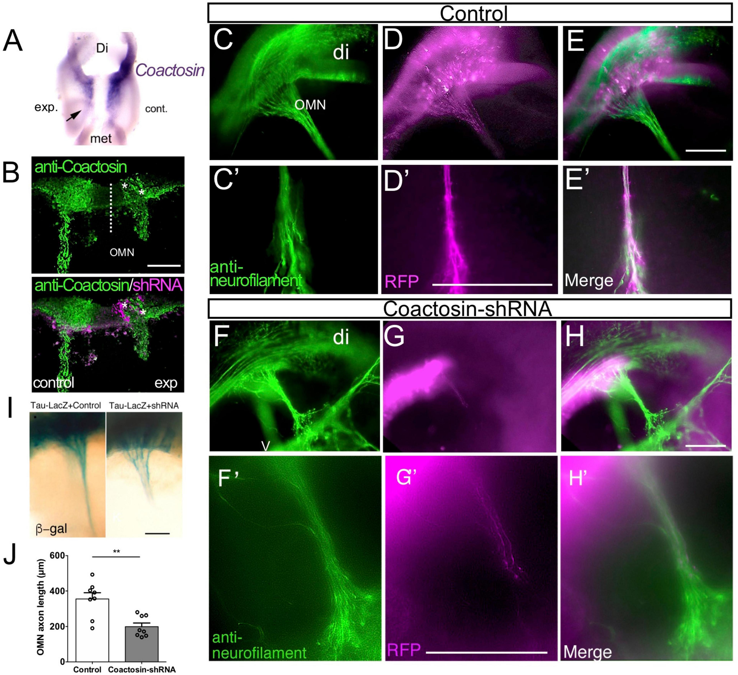 Effects of coactosin knockdown on elongation of the oculomotor nerve. (A) Reduction in coactosin mRNA levels following transfection with coactosin short hairpin RNA (shRNA). Ventral view of the midbrain showing the weak expression on the experimental side (exp) compared with that in the control side (cont). (B) Coactosin (green) expression is reduced in the coactosin shRNA-/RFP-expressing oculomotor nucleus (OMN) on the experimental side (asterisks). (C–H) Effects of scrambled (control) shRNA (C–E) or coactosin shRNA (F–H) transfection on the oculomotor nerve. Double staining of RFP and neurofilament (green) shows the control shRNA-transfected axons extending toward an eye (C′–E′: higher magnification of C–E). In contrast, coactosin shRNA transfection disrupted the elongation of the oculomotor nerve (F′–H′: higher magnification of F–H). (I) Effects of control shRNA (left) or coactosin shRNA (right) transfection on the tau-LacZ-expressing oculomotor nerve. The tau-lacZ-labeled axons paused at the midway of their migration route following coactosin knockdown. (J) The length of oculomotor axons from its nucleus shows a shrinkage with coactosin shRNA than control shRNA (eight embryos for each, **p = 0.0047, Mann–Whitney U test). Scale bar: 100 μm.
