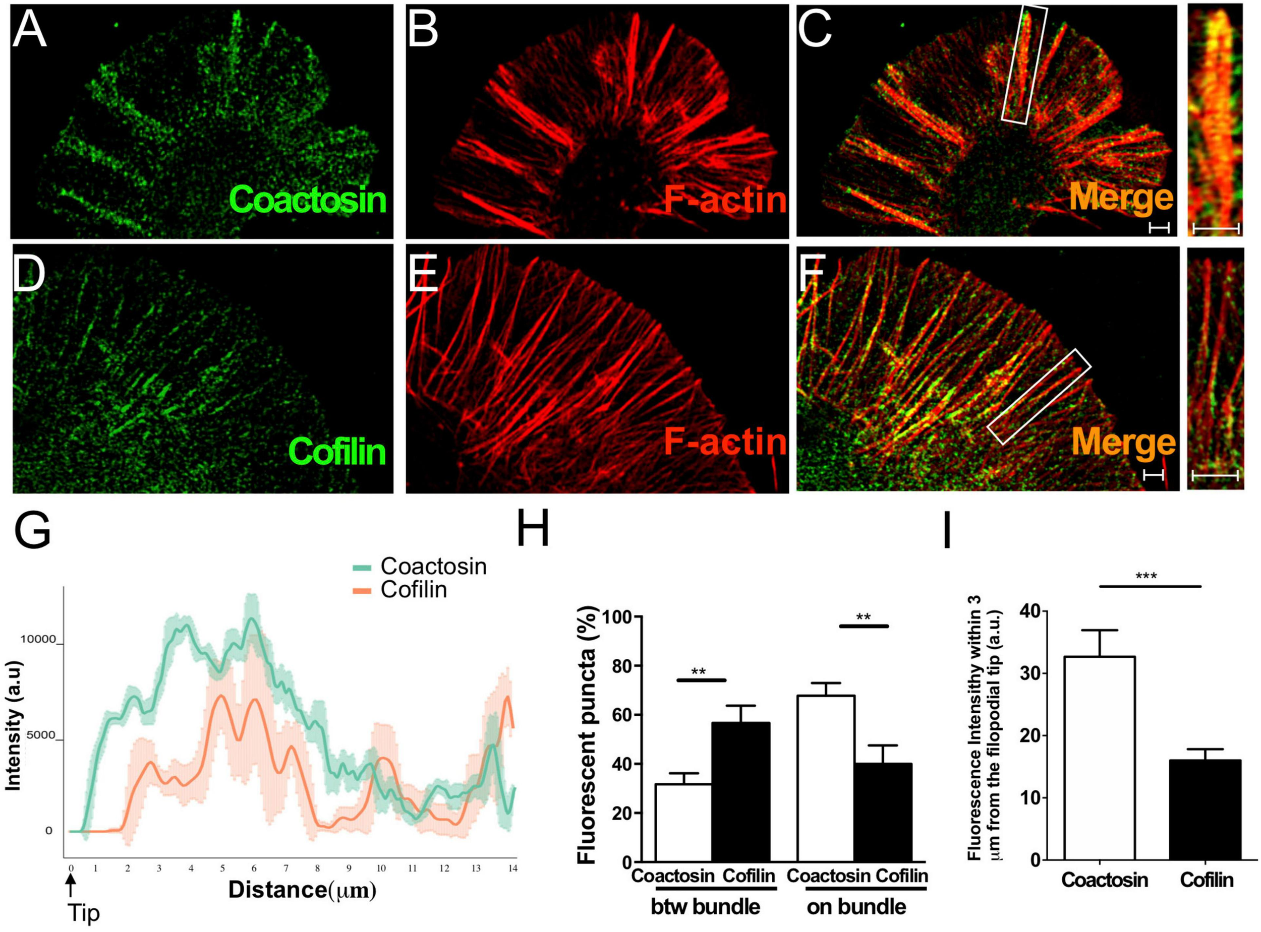We previously reported that coactosin is located at the tip of filopodia of neural crest cells and induces filopodial extension (Hou et al., 2013). As expected, we observed that intrinsic coactosin was localized to filopodia that contained the bundled F-actin, and was partially distributed to lamellipodia between the bundles at the peripheral (P)-domain of growth cones (Figures 3A–C). In contrast, cofilin was discontinuously distributed along the actin bundles and sparsely expressed at the distal part of the growth cone (Figures 3D–F). Quantitative analysis of the fluorescence intensities in the filopodia showed that coactosin, and not cofilin, continuously accumulated near the tips of filopodia (Figure 3G). Coactosin distribution was quantified by measuring coactosin-positive pixels relative to phalloidin-positive pixels at the P-domain of growth cones. Approximately 68% of coactosin-positive puncta were distributed on phalloidin-positive actin bundles within the filopodia while the remaining puncta were located between the bundles (lamellipodia) (Figure 3H). In addition, compared with the sparce distribution of cofilin, coactosin was abundantly detected even within 3 μm from the tip of filopodia (Figure 3I). SIM imaging results revealed the precise association between intrinsic coactosin and actin filaments.