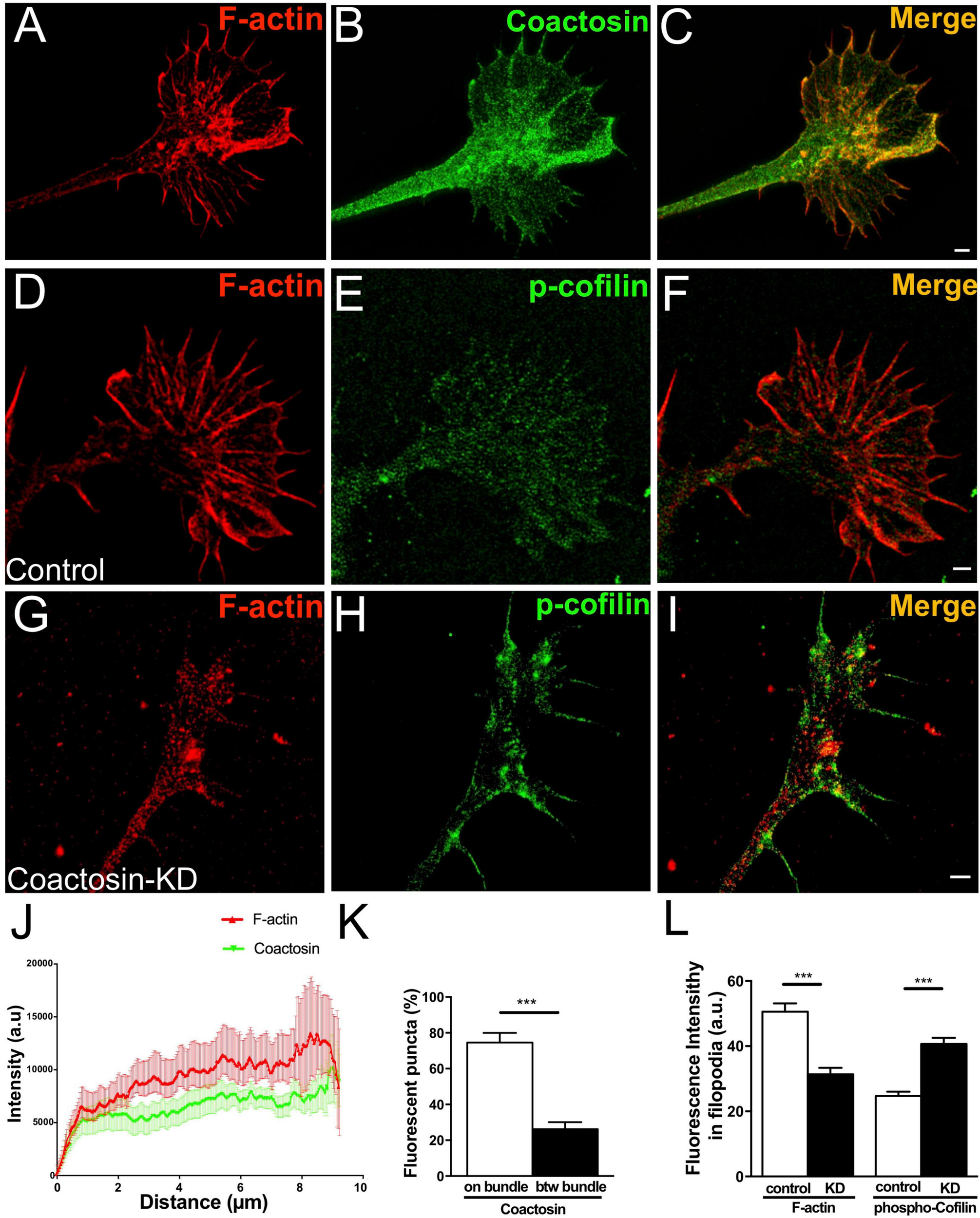 Next, we observed the localization of introduced coactosin-GFP at the P-domain of growth cones of NG108-15 cells (Figures 4A–C; also see Supplementary Movie 1). Coactosin-GFP was localized at the actin bundles within the filopodia (Figure 4J) and further accumulated on the actin bundles than intrinsic coactosin (for “between bundles”, coactosin-GFP, 16.31 ± 2.41% vs. coactosin, 29.81 ± 4.36%, 23–26 bundles, p = 0.037, Mann–Whitney U test; for “on bundles”, coactosin-GFP, 81.77 ± 3.78% vs. intrinsic coactosin, 67.77 ± 5.14%, 19 bundles for each, p = 0.01, Mann–Whitney U test). Conversely, coactosin association with actin filaments was abolished when mutated coactosin (K75A) that cannot bind to actin was expressed (Provost et al., 2001; Hou et al., 2013) (Figures 4D–F). Moreover, coactosin overexpression did not influence the distribution of intrinsic cofilin, in which cofilin remained on the filopodial actin bundles except for at the tip of filopodia (Figures 4G–I,J).