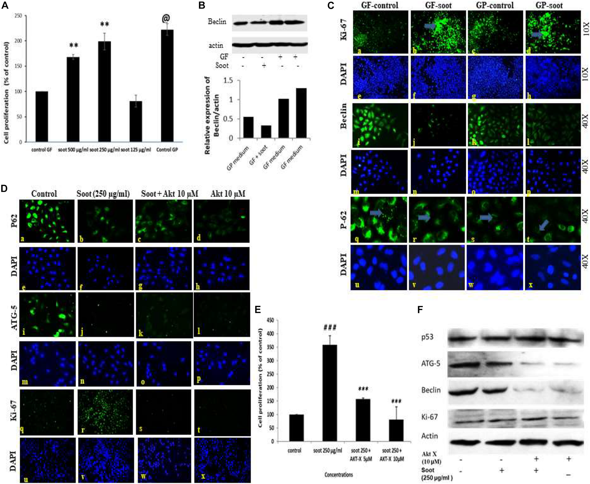 Fullerene-soot inhibited starvation-induced autophagy in A549 cells, which is reversed by Akt Inhibitor X. (A) Cell proliferation assay in the presence and absence of fullerene soot in glucose-free medium. ∗∗p < 0.01, @p < 0.001 compared with control GF. (B) Western immunoblotting of beclin due to exposure of soot in the presence and absence of glucose (top), histograms representing densitometric intensity of bands (down). (C) (a–d) expression profile of Ki-67 (green fluorescence) in the presence and absence of soot in the mediums with and without glucose. a, glucose-free (GF) medium without soot; b, glucose-free medium with soot; c, medium with glucose; d, medium with glucose with soot. (i–l) expression profile of Beclin-1. i, glucose-free medium; j, glucose-free medium with soot; k, medium with glucose; l, medium with glucose after soot exposure. (q–t) p-62 localization profile after the exposure of fullerene soot in glucose-free and glucose-containing medium. q, glucose-free medium; r, free medium with soot; S, medium with glucose; t, fullerene soot exposure in medium with-glucose. (D) Protein expression profiles of genes in glucose-free medium, after treatment with Akt Inhibitor X, by Immuno-cytochemistry. Expression profile of p62 (×20). a, glucose-free medium; b, medium with soot; c, soot exposure with Akt Inhibitor X (5 μM); d, soot with Akt Inhibitor X (10 μM). ATG-5 expression profiles (× 20), (i–l); i, glucose-free (GF) medium; j, medium with soot; k, soot exposure with Akt inhibitor (5 μM); l, soot exposure with Akt Inhibitor X (10 μM). Ki-67 expression profile (× 10). q, glucose-free medium; r, medium with soot; s, fullerene soot exposure with Akt Inhibitor X (5 μM); t, soot exposure with Akt Inhibitor X (10 μM). DAPI staining (blue image) is shown below, respectively, in each green fluorescence image. (E) Effect of Akt Inhibitor X on the cell proliferation of A549 cells due to soot in glucose-free medium. ###p < 0.01 compared with control and ∗∗∗p < 0.001 compared with the fullerene soot-treated group. (F) Western immunoblotting of autophagic proteins in response to Akt Inhibitor X.