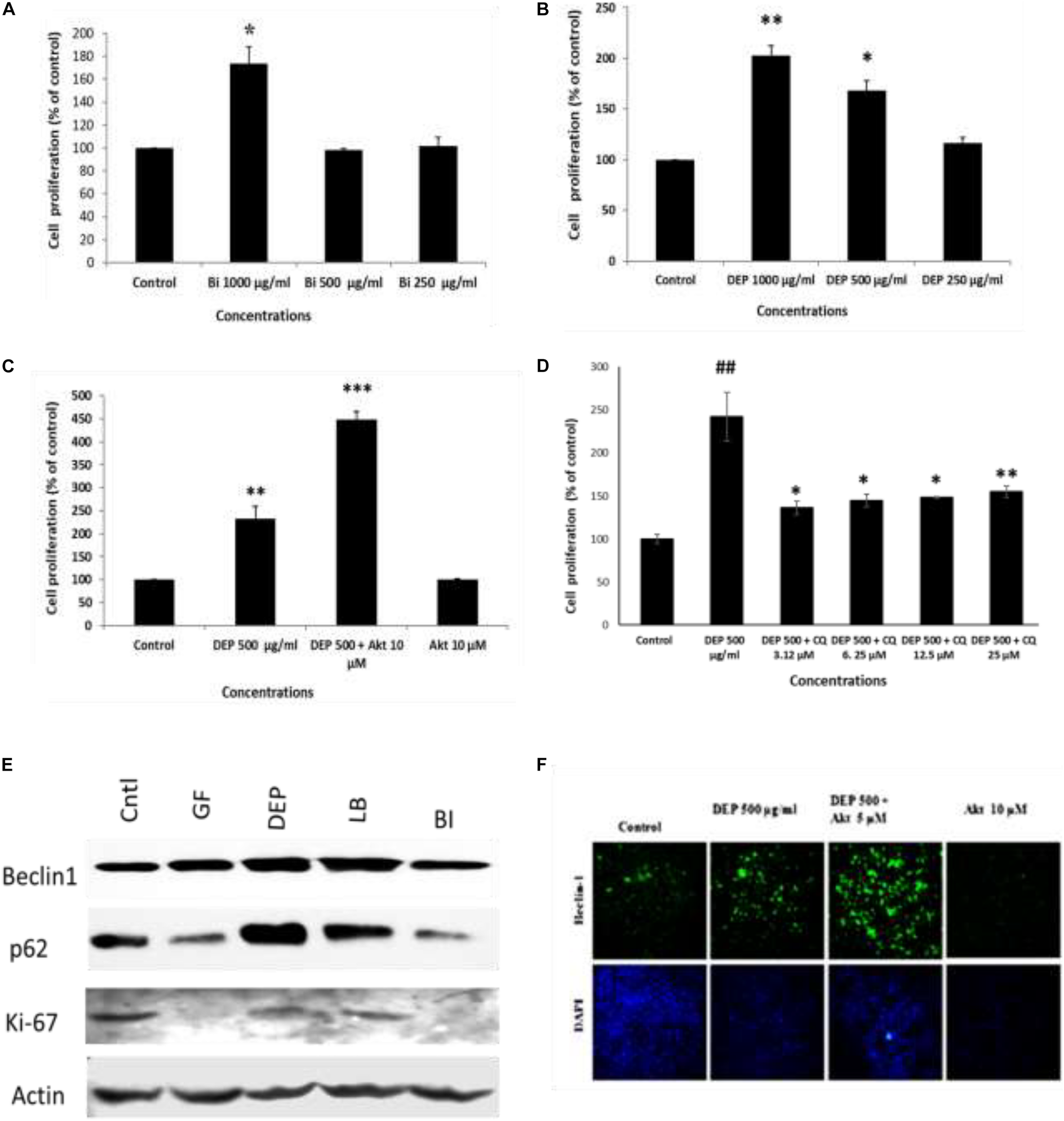 Furthermore, to understand the effect of ambient soot, the effect of diesel soot (diesel exhaust particles or DEP) and biomass burnt (BI) soot (wood burning) was evaluated on A549 cells. As seen in Figure 4A, biomass burning soot did not cause cell death (reduction in cell viability) of lung airway epithelial A549 cells. Soot concentrations (250, 500, and 1,000 μg/ml) increased the MTT score at 24 h, showing cell proliferation of lung epithelial A549 cells. Similarly, we also tested the effect of diesel exhaust particles. Lung A549 cells were exposed to different concentrations (250, 500, and 1,000 μg/ml) of DEP for a period of 24 h. As seen in Figure 4B, DEP significantly caused the cell proliferation of A549 cells as compared with control cells. In addition to cell proliferation, we also tested the expression profiles of autophagic proteins in response to DEP and biomass-burnt soot. As shown in Figure 4E, soot exposure to A549 cells significantly upregulated the expressions of autophagic proteins in response to both types of soot. We have also tested the role of Akt Inhibitor X on DEP- and BI-induced cell proliferation and autophagic responses. Cells were treated with different concentrations of DEP and BI and in the absence of glucose, and the effect of Akt Inhibitor X was measured on the cell proliferation and autophagic responses. DEP and BI soot exposure to the A549 cells significantly stimulated cell proliferation in 24 h. Interestingly, as demonstrated in Figure 4C, Akt Inhibitor X (10 μM) did not inhibit the DEP-induced cell proliferation of human lung epithelial cells. In fact, Akt inhibitor treatment significantly potentiated the DEP-induced cell proliferation. Co-exposure of Akt Inhibitor X with DEP also showed an increase in the expression of autophagy protein beclin-1 in a dose-dependent manner. However, chloroquine, an inhibitor of autophagic flux, has significantly inhibited DEP-induced cell proliferation of A549 cells (Figure 4). Similarly, autophagic inhibitor 3-MA has also significantly inhibited DEP-induced cell proliferation in a dose-dependent manner (Supplementary Figure 4).