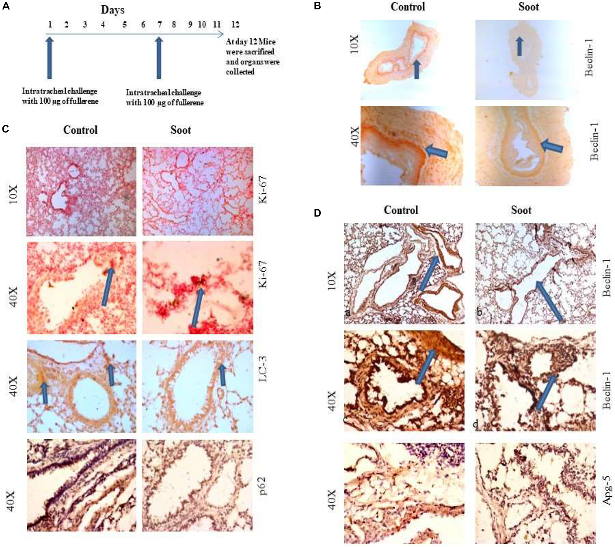 To further clarify that soot inhibited autophagy in in vivo conditions, we tested the effect of fullerene soot on autophagic response when it is intranasally delivered in mice. To accomplish this, 100 μg of soot was intranasally delivered to mice. A total of two intranasal challenges were given to mice in 12 days with an interval of 6 days (exposure plan of mice is depicted in Figure 6A. Control mice were delivered with saline alone. As seen in Figure 6C, basal autophagic markers were inhibited by the soot challenge. As seen in Figure 6C, fullerene soot has significantly upregulated Ki-67 protein expression in the lung airway epithelium, giving confirmation of the proliferation-inducing property of fullerene soot. Fullerene soot also downregulated autophagy-responsive protein beclin-1 in the lungs and in the esophagus, depicting its important autophagy-inhibiting properties. In addition to beclin-1 gene expression, fullerene soot has also downregulated the expressions of autophagy proteins LC3, p62, and APG-5 in the lung (Figure 6D). These results suggest that fullerene soot inhibits autophagy and induces cell proliferation also in in vivo conditions in healthy mice.