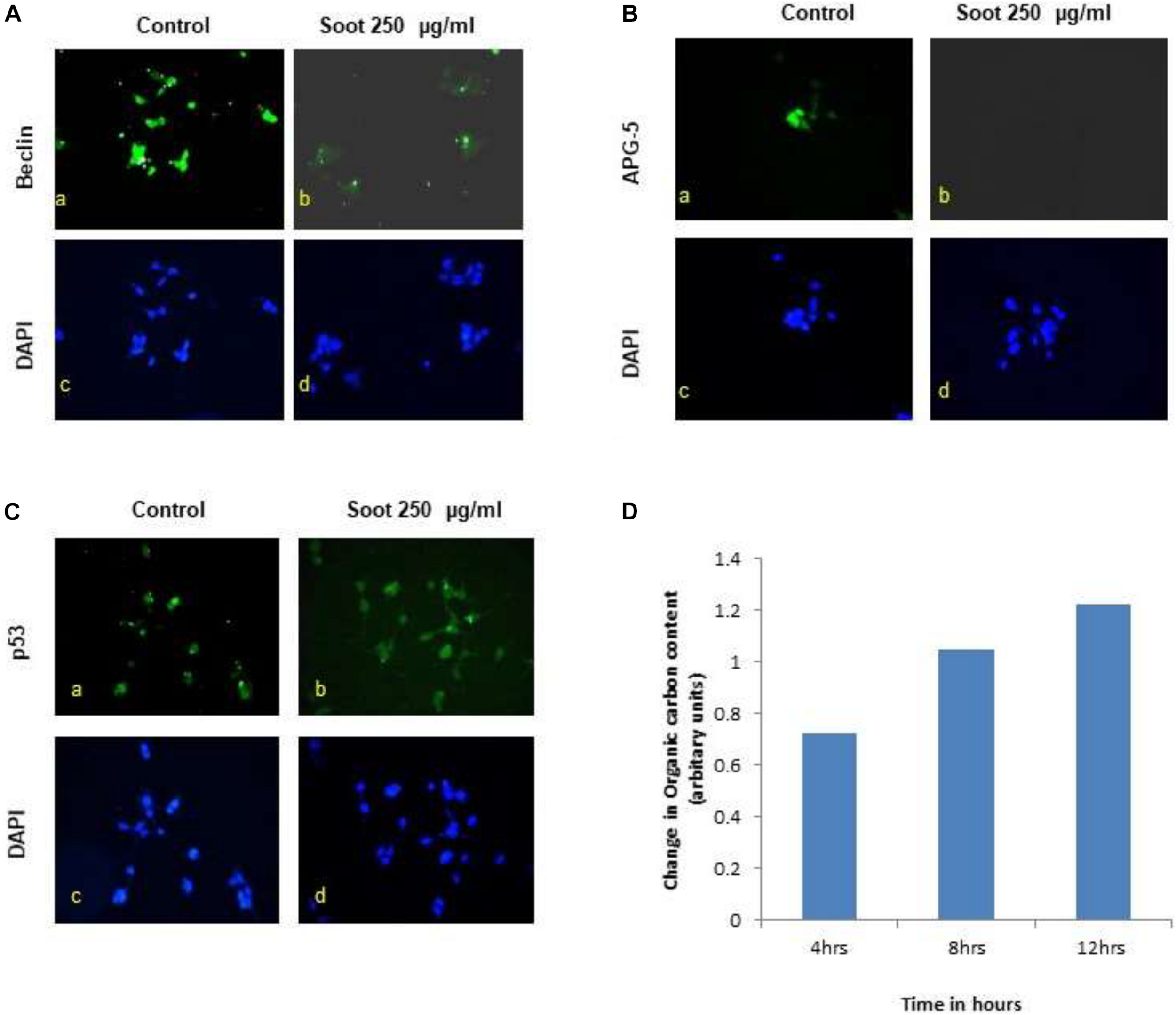 Effect of fullerene nanoparticles on the expression profile of autophagy (in HEK-293), organic carbon content, and p53 translocation. (A,B) Effect of fullerene soot in HEK-293 cells on beclin and ATG-5 expressions (in glucose free medium). (C) Effect of fullerene soot on translocation of p53 protein in HEK 293 cells. (D) Organic carbon content at the elemental level using the OCEC instrument was analyzed.