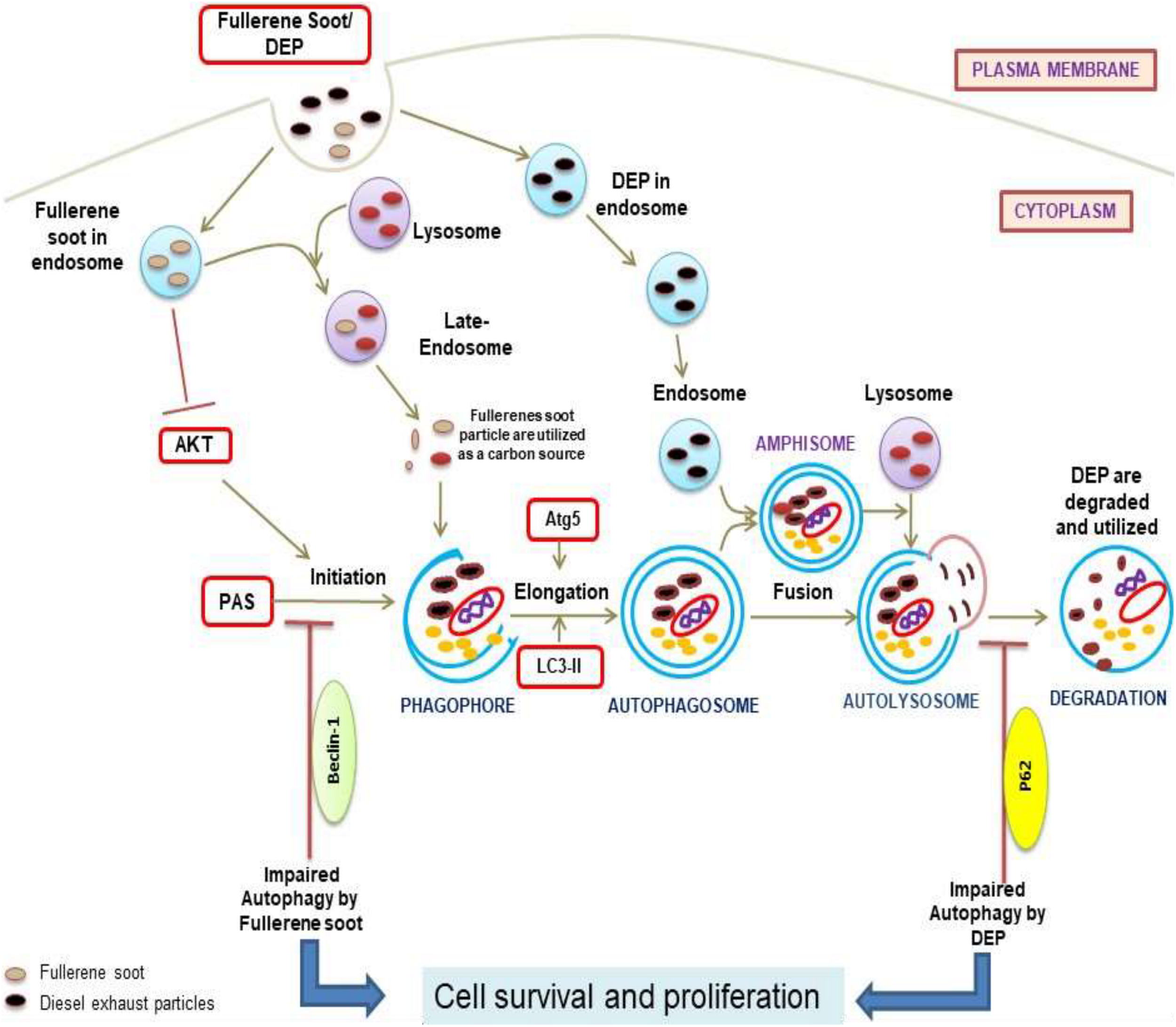 Diagram representation of the proposed mechanisms of action due to soot (fullerene soot and DEP)-mediated inhibitions of autophagy and subsequent induction of cell proliferation. As seen in the figure, fullerene soot inhibited autophagy at the level of beclin as they are directly utilized as an energy source. However, DEP inhibits the autophagic flux and does not allow the autophagy to complete possibly by regulating the expression profile of p62.