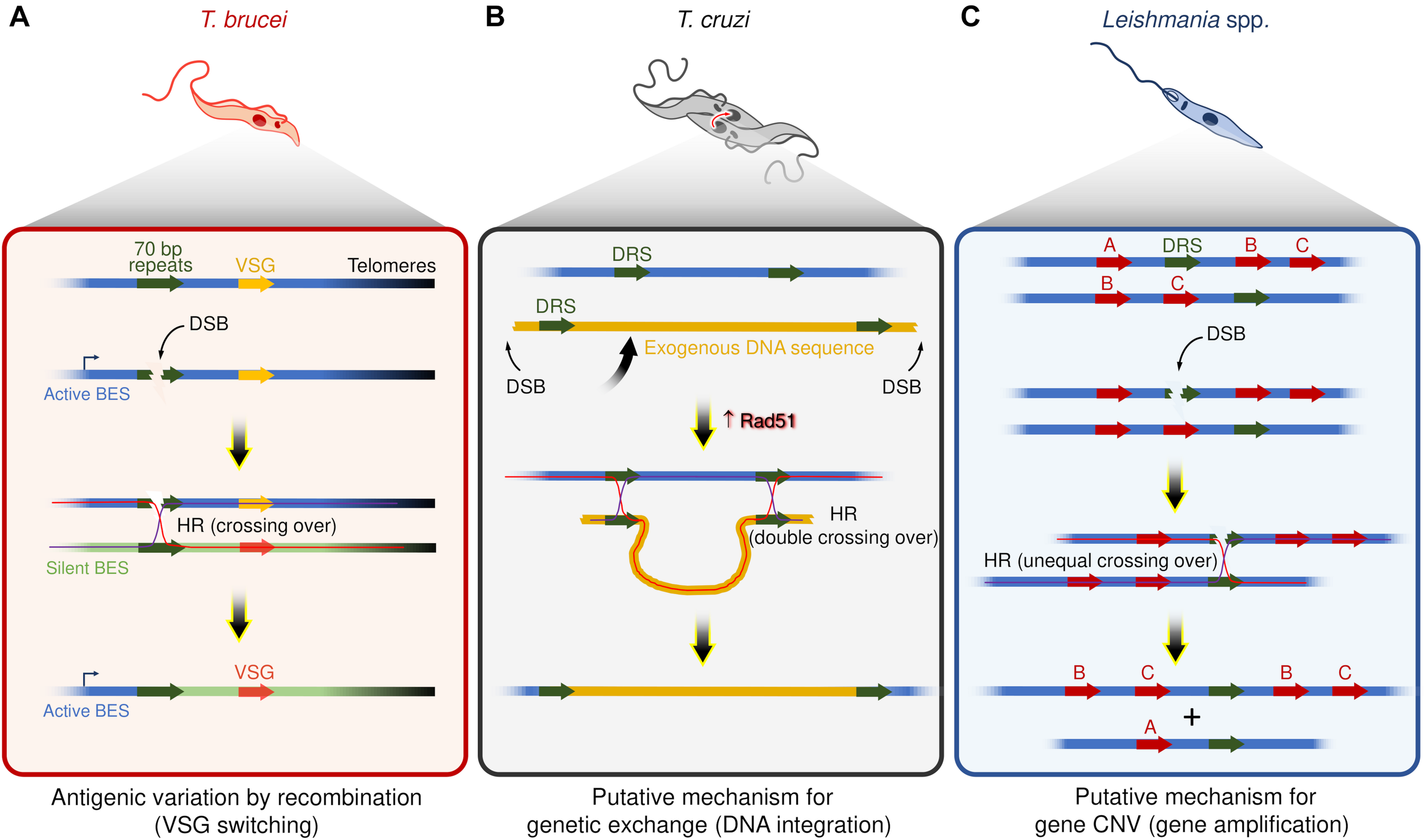 Examples of putative mechanisms dependent on recombination events and DSBs in trypanosomatids. (A) Antigenic variation by recombination events in T. brucei – DSBs within repeat elements (70 bp repeats) are catalysts for VSGs switching. Of note, DSBs occur naturally in active bloodstream expression sites (BES). (B) Genetic exchange in T. cruzi – Hybrid T. cruzi cells have slightly increased Rad51 expression (Alves et al., 2018), which may contribute to driving homologous recombination (HR) between direct repeated sequences (DRS) during the genetic exchange, resulting in the integration of an exogenous DNA. (C) Gene amplification in Leishmania spp. – DSBs nearby or within DRS may trigger HR and lead to gene copy number variation (gene CNV). In the scheme, the genes B and C were amplified.