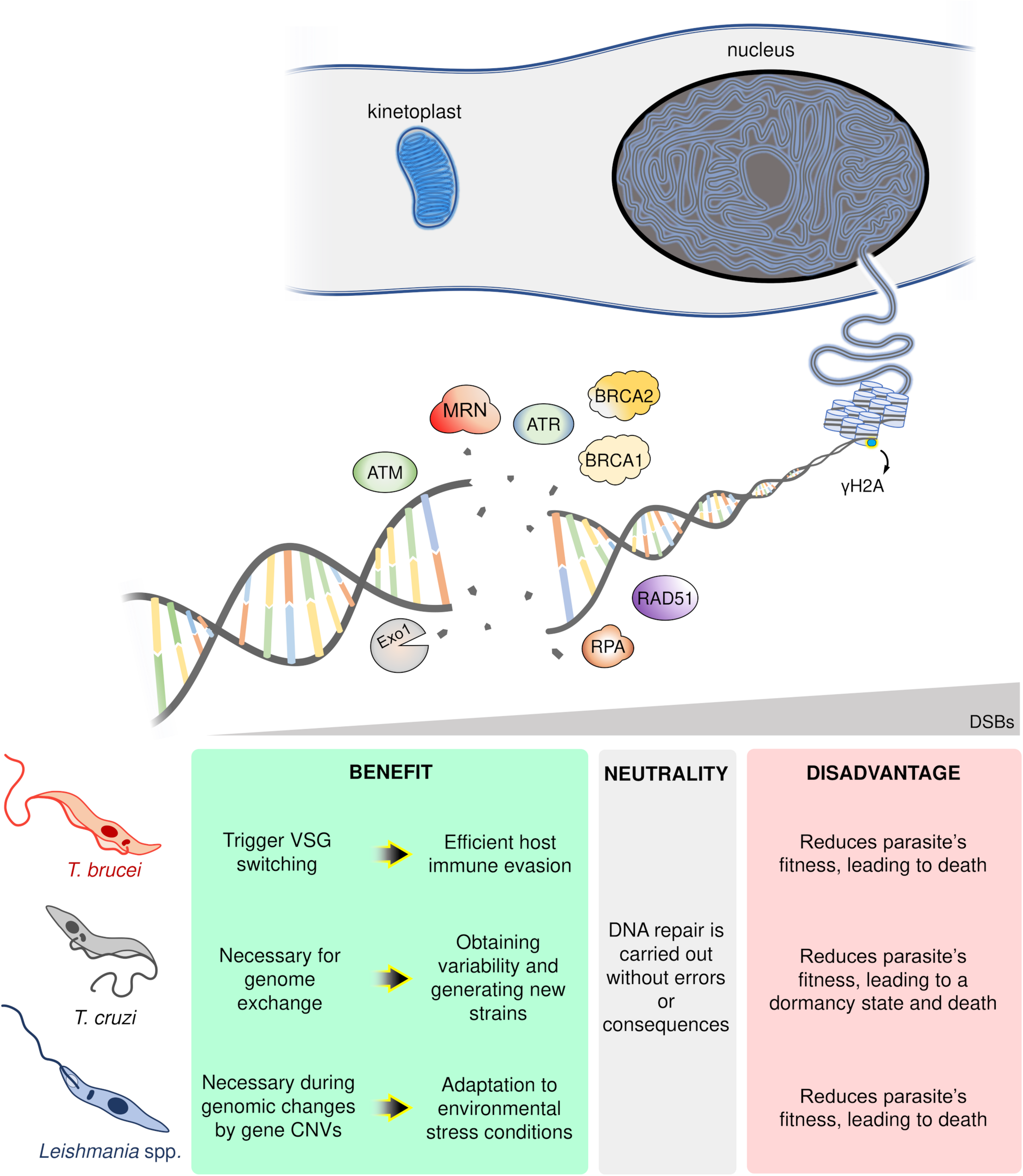 DNA double-strand breaks, homologous recombination, DNA repair, Trypanosoma brucei , Trypanosoma cruzi , Leishmania spp.