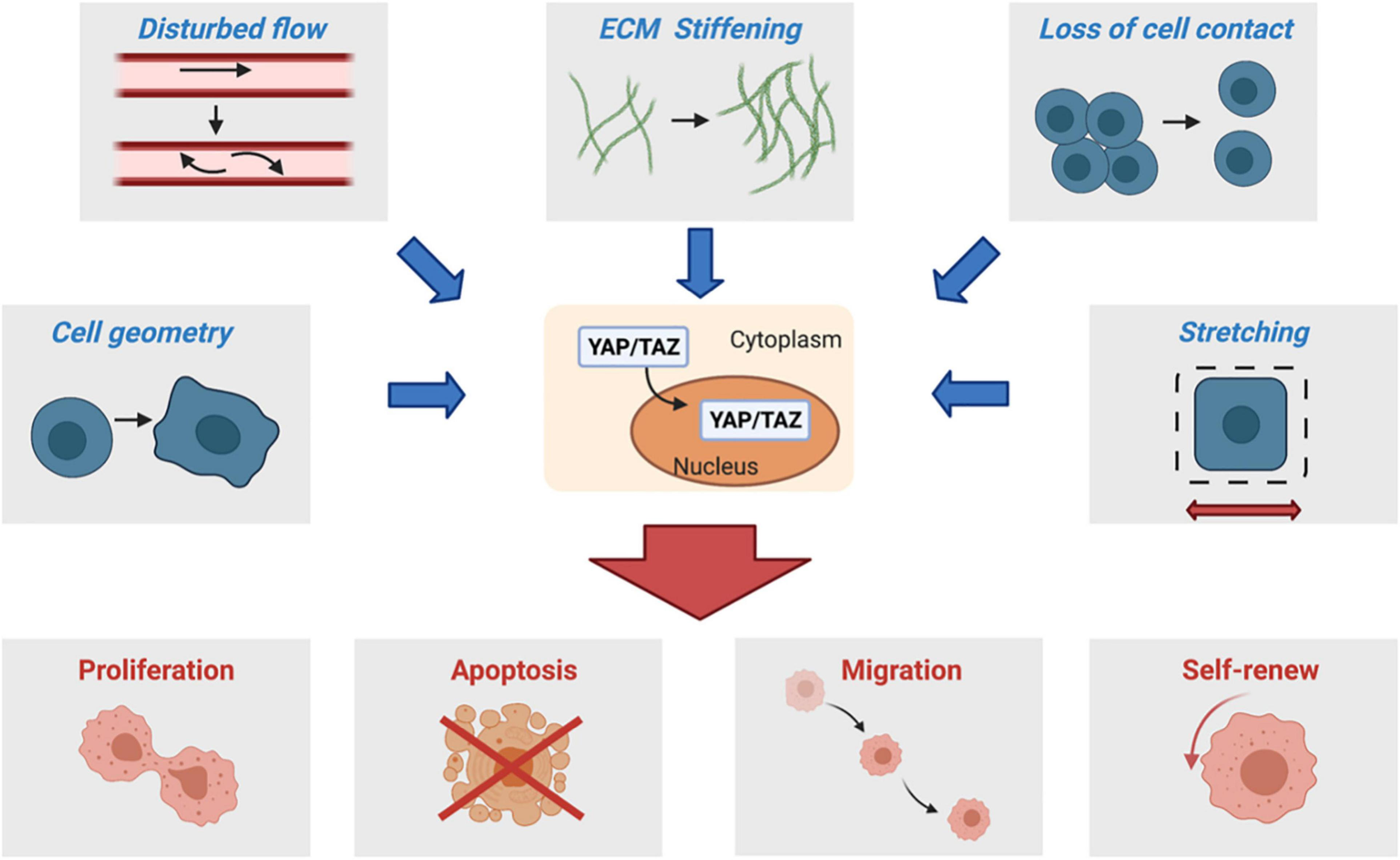 Figure 1. Changes in the biophysical environments, such as those resulting from ECM stiffening, loss of cell contact, disturbed flow, cell spreading, and stretching, promote nuclear translocation of YAP/TAZ and thus activate their transcription programs for cell proliferation, survival, migration, and self-renew, among others.