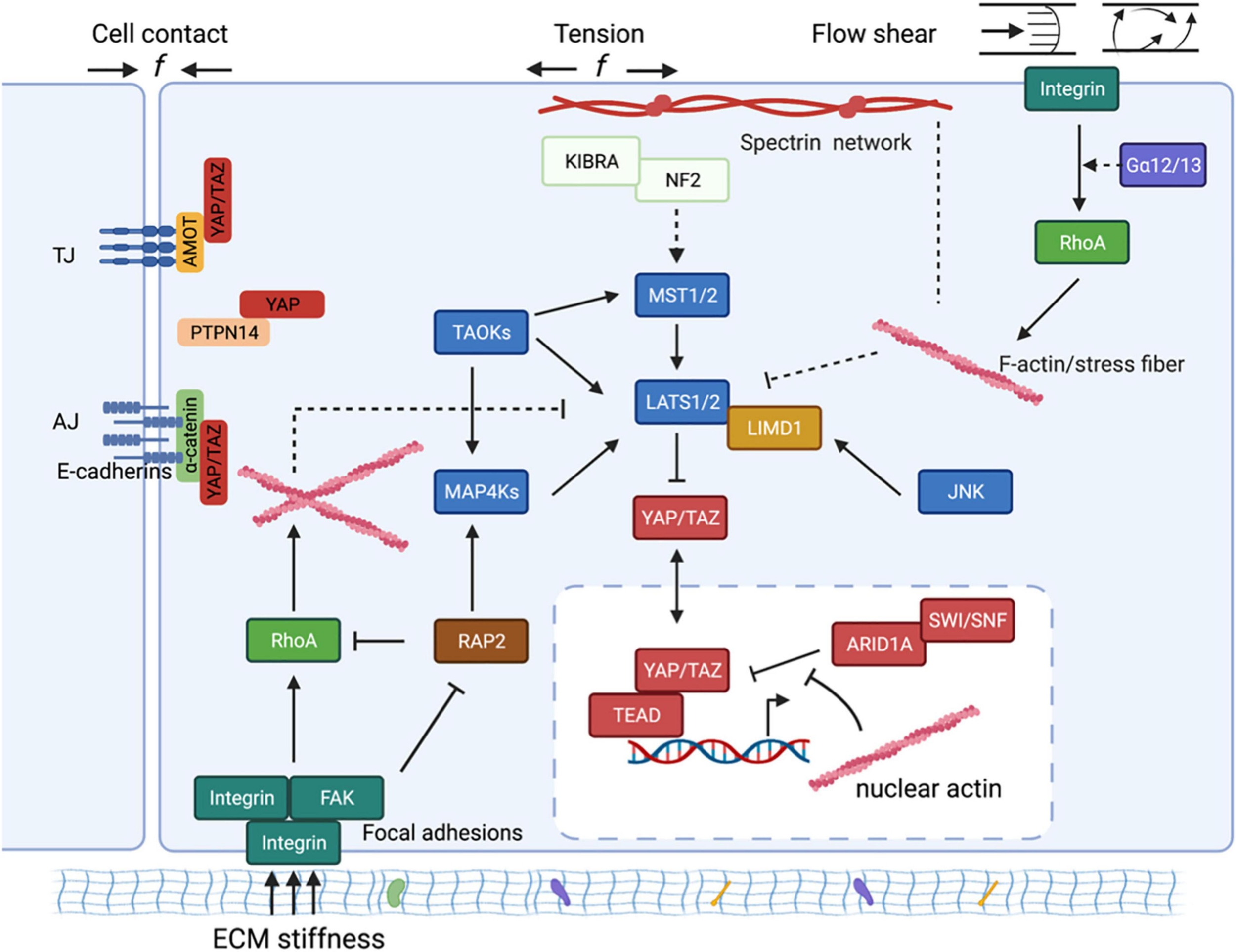 Keywords: YAP, TAZ, the Hippo pathway, mechanotransduction, ECM stiffness, stretch, flow shear, contact inhibition of cells