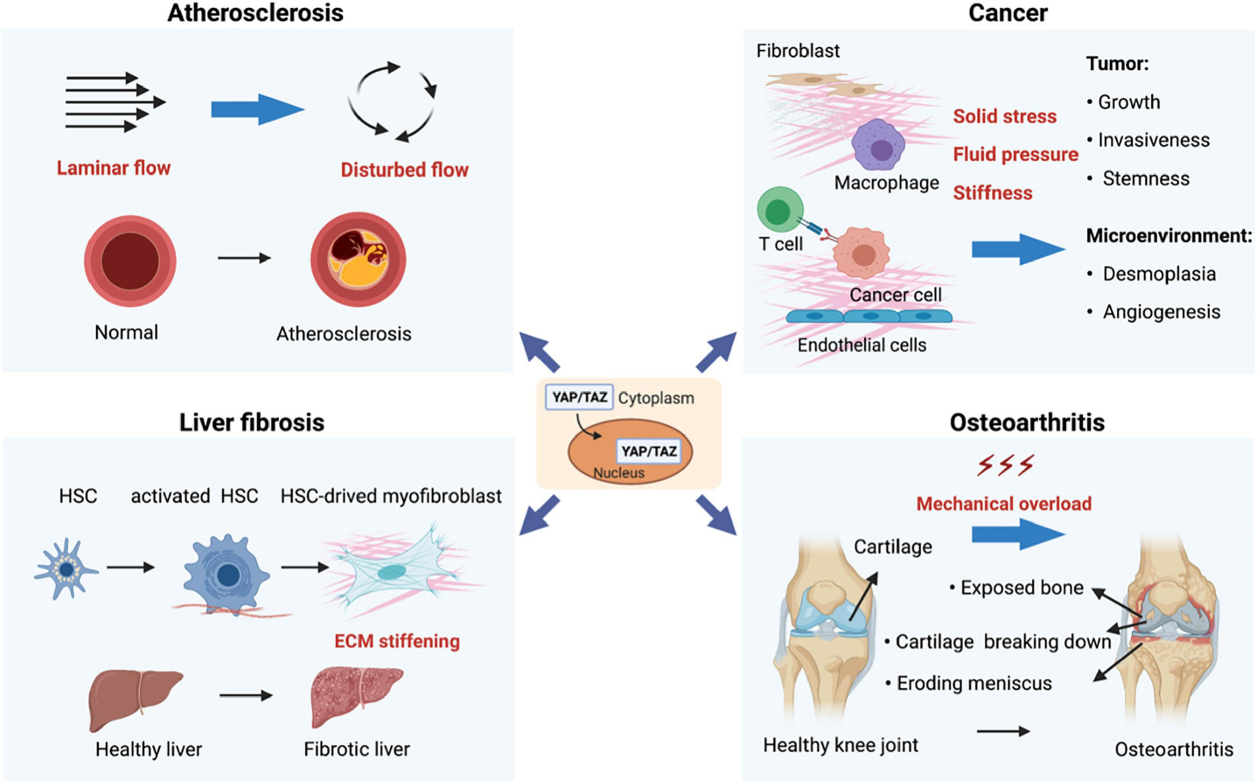 Figure 3. Mechanoregulation of YAP/TAZ in human diseases. (1) Disturbed flow-activated YAP/TAZ is a key factor that promotes atherogenesis. (2) Mechanical properties in the tumor microenvironment (such as solid stress, fluid pressure, and stiffness) act through YAP/TAZ to regulate various aspects of tumor initiation and progression. (3) YAP/TAZ-mediated mechanoresponses strongly promote organ fibrosis. For instance, hepatic injuries and subsequent inflammatory responses activate quiescent hepatic stellate cells (HSCs), leading to activation and expansion of HSCs and accumulation of extracellular. (4) Osteoarthritis (OA) is mainly caused by mechanical overload, and YAP is both necessary and adequate to preserve cartilage homeostasis in OA.