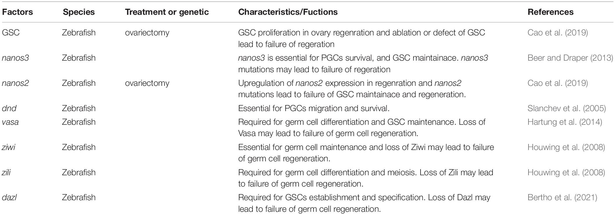 Table 2. Summary of effects of factors contributing to germ cell regeneration.