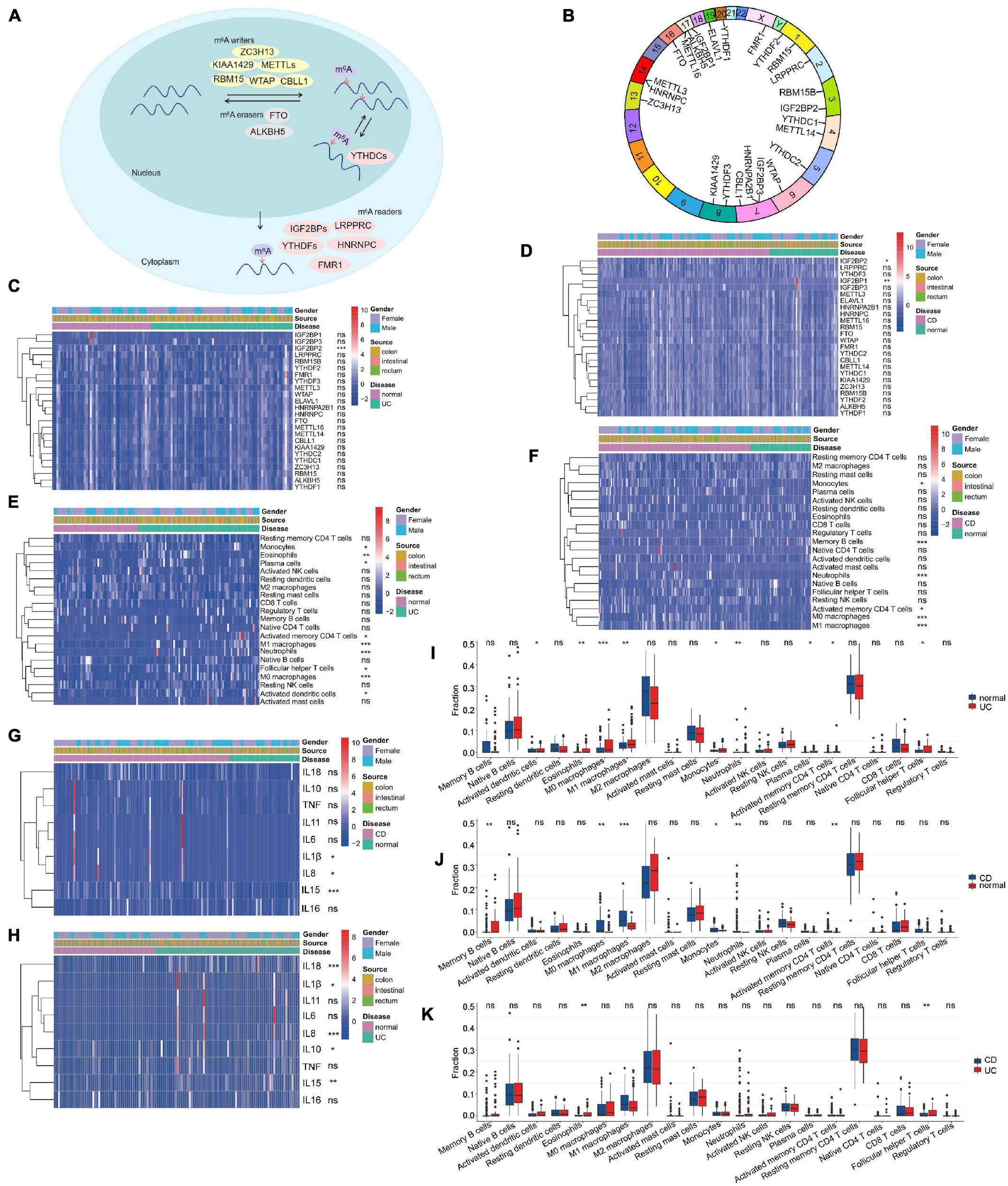 Landscape of m6A regulators and immune microenvironment in inflammatory bowel disease (IBD). (A) Summary of the reversible process of m6A regulator–mediated methylation. (B) The location of m6A regulators on 24 chromosomes using GSE111889 cohort. (C,D) The expression of 24 m6A regulators among ulcerative colitis (UC) panel (C), Crohn’s disease (CD) panel (D), and normal tissues. (E,F,I–K) The difference of immune cell infiltration among UC, CD, and normal tissues. (G,H) The expression of inflammatory factors among normal, UC panel (H), and CD tissues panel (G). The asterisks represented the statistical P-value (*P < 0.05; **P < 0.01; ***P < 0.001).