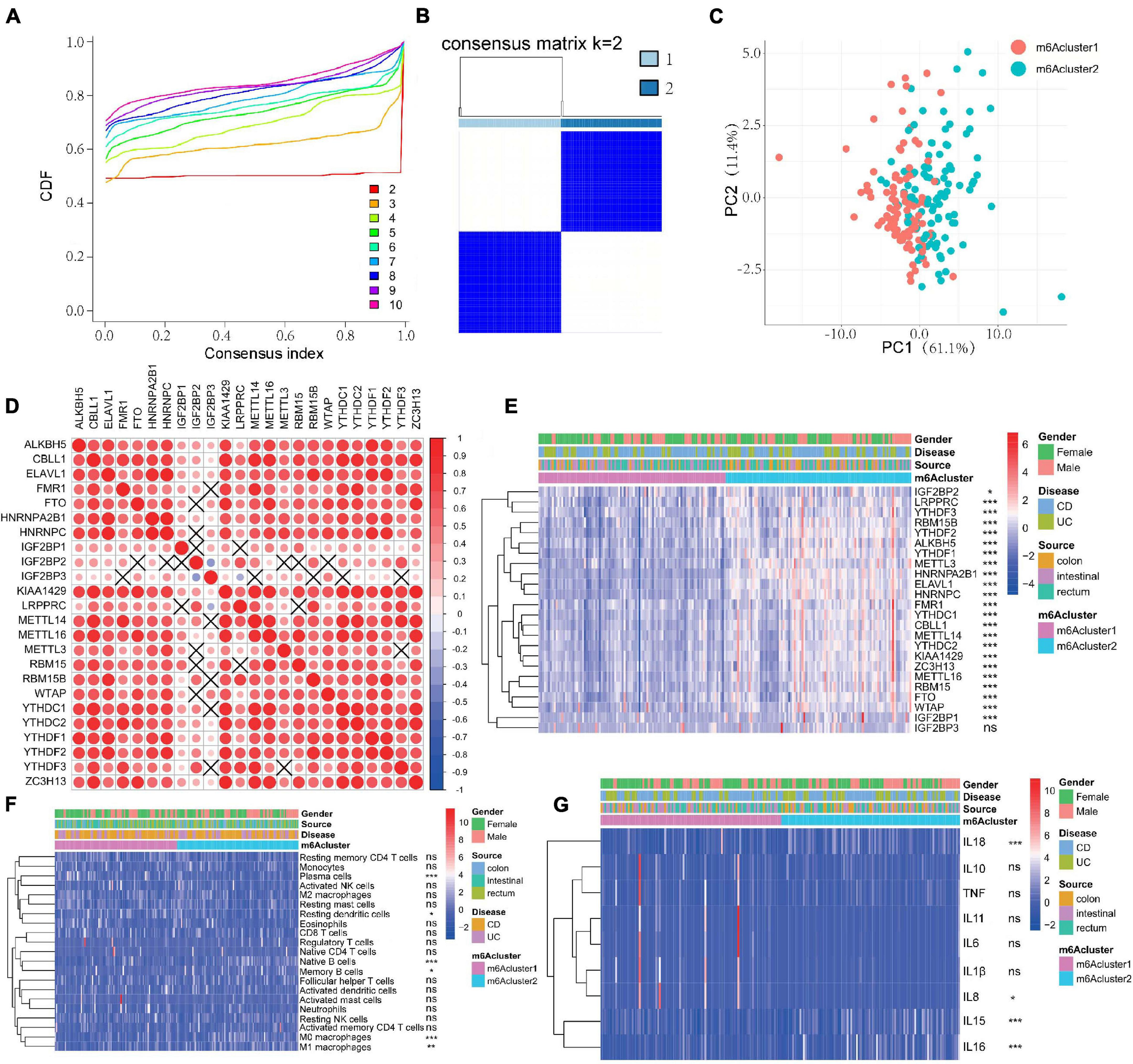 m6A methylation modification patterns are correlated with the clinical characteristics and the mucosal immune microenvironment in IBD. (A–C) Consensus clustering identified two subgroups according to the expression of m6A regulators. (D) Evaluation the pairwise correlations among 24 m6A regulators’ expression. (E) The expression of 24 m6A regulators in different m6A subtypes and disease subtypes. (F,G) The difference of mucosal immune cells infiltration panel (F) and inflammatory factors panel (G) between m6Acluster1 and m6Acluster2. The asterisks represented the statistical P-value (*P < 0.05; **P < 0.01; ***P < 0.001).