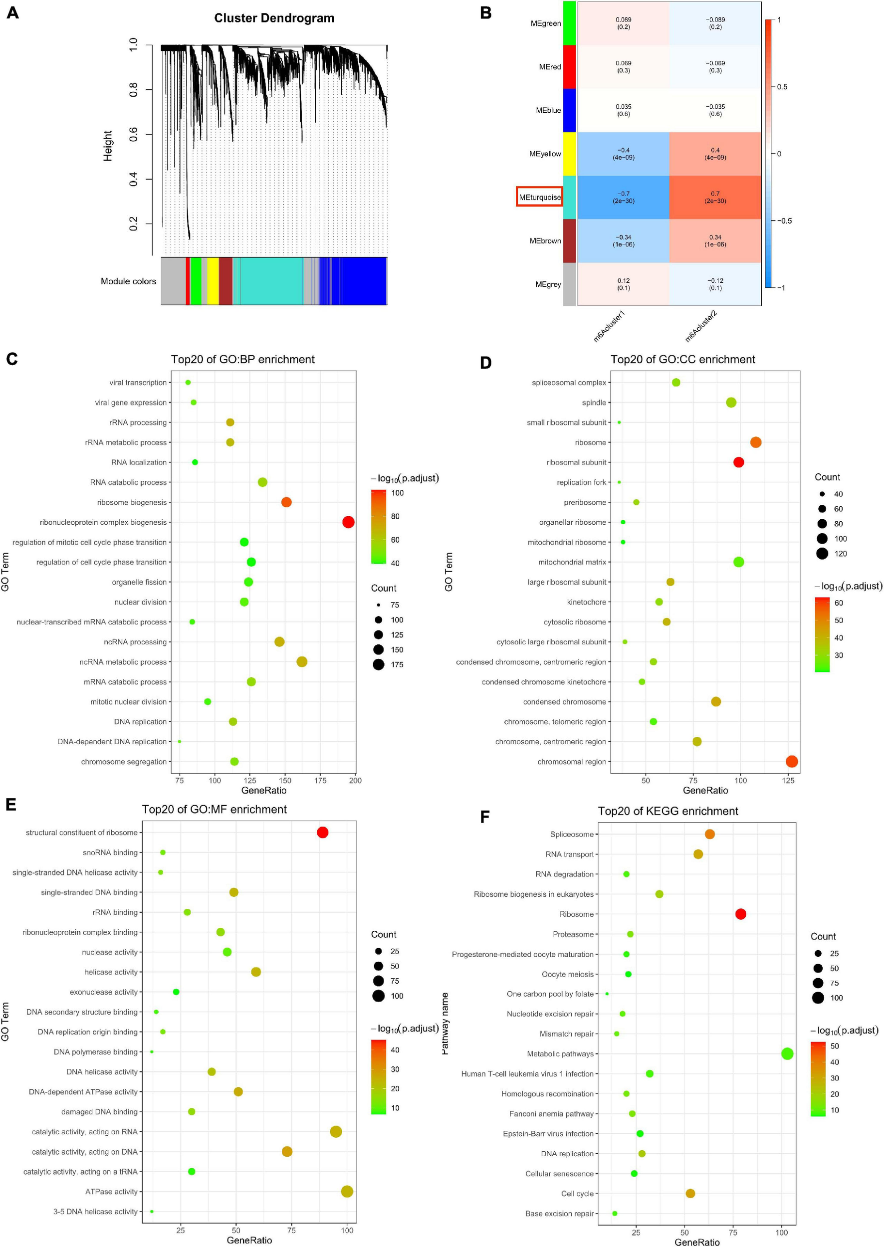 To explore the differentially expressed genes in the two m6Aclusters, we used the Edger package in GAPTools. Subsequently, 4737 differentially expressed genes were screened out between the two clusters, among which 2274 genes were upregulated and 2463 genes were downregulated. A weighted gene co-expression network was then constructed (Supplementary Figure 1C). After calculating the eigengenes of each module, performing cluster analysis on the modules, and merging the modules close to each other into new modules, we obtained seven modules (Figures 3A,B). The turquoise module was the most correlated with the m6Acluster classification phenotype (Figure 3B and Supplementary Table 3; P = 2e–30). The R package clusterProfiler was used to analyze the function and pathway information of the top 20 enriched genes in the turquoise module. As shown in Figure 3C, genes in the turquoise module were markedly enriched in the biological processes (BP), including ribonucleoprotein complex biogenesis and ribosome biogenesis (Figure 3C; P < 0.05); CC were involved, including the composition of ribosomal subunit, chromosomal region (Figure 3D; P < 0.05); MF-related genes were markedly enriched in structural constituent of ribosome (Figure 3E; P < 0.05); the KEGG pathway was enriched in ribosome and spliceosome (Figure 3F; P < 0.05).