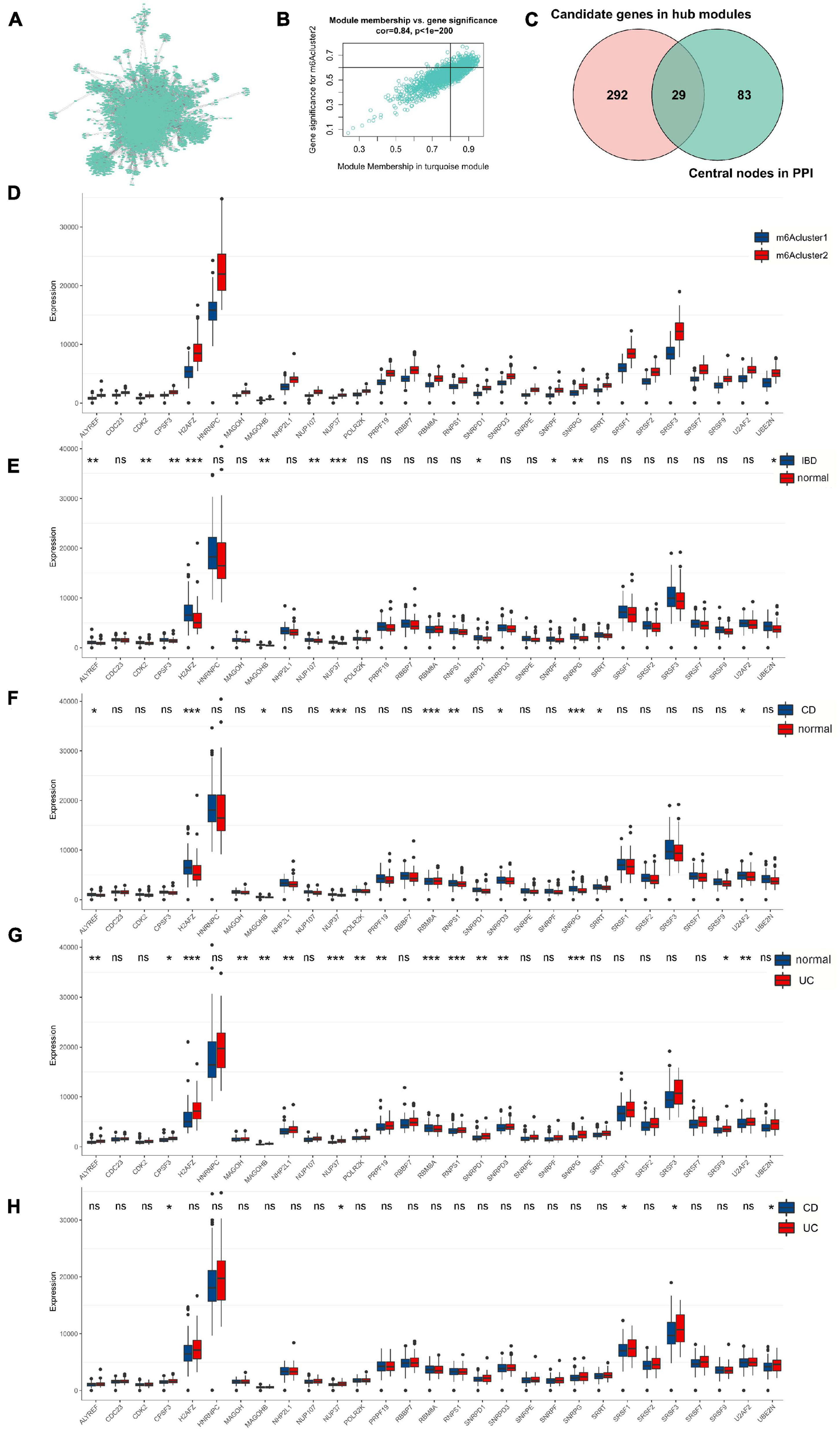 Twenty-nine m6A phenotype-related hub genes affect disease characteristics in IBD. (A) The PPI network of genes in the key module. (B) The significance genes in the turquoise module. (C) The hub genes of the interaction network are intersected with the hub genes identified in the m6A-related module. (D) The 29 genes’ expression in different m6Acluster classification. (E–H) The 29 genes’ expression between normal, UC, and CD tissues. The asterisks represented the statistical P-value (*P < 0.05; **P < 0.01; ***P < 0.001).