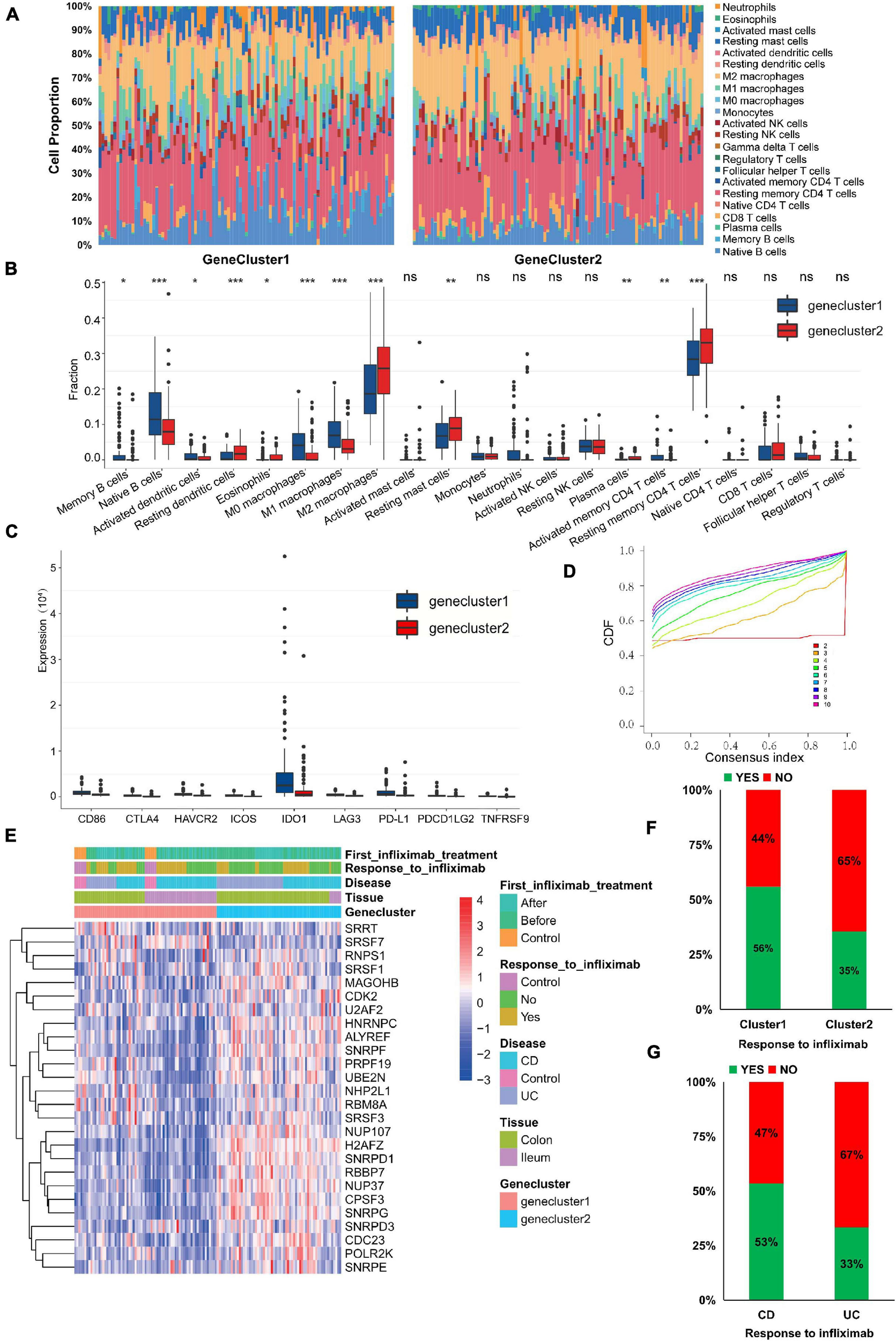 m6A phenotype–related hub genes influence the immune infiltration and therapeutic response. (A,B) The immune cell infiltrating levels in different gene cluster subtypes in the GSE111889 cohort. (C) The expression differences of nine important immune checkpoints among different gene clusters. (D) Consensus clustering cumulative distribution function (CDF) for k = 2–10. (E) The expression of hub genes, anti-TNF therapeutic response, and disease subtype between genecluster1 and genecluster2. (F,G) Infliximab therapeutic response in different gene clusters (F) and disease subtypes (G). The asterisks represented the statistical P-value (*P < 0.05; **P < 0.01; ***P < 0.001).