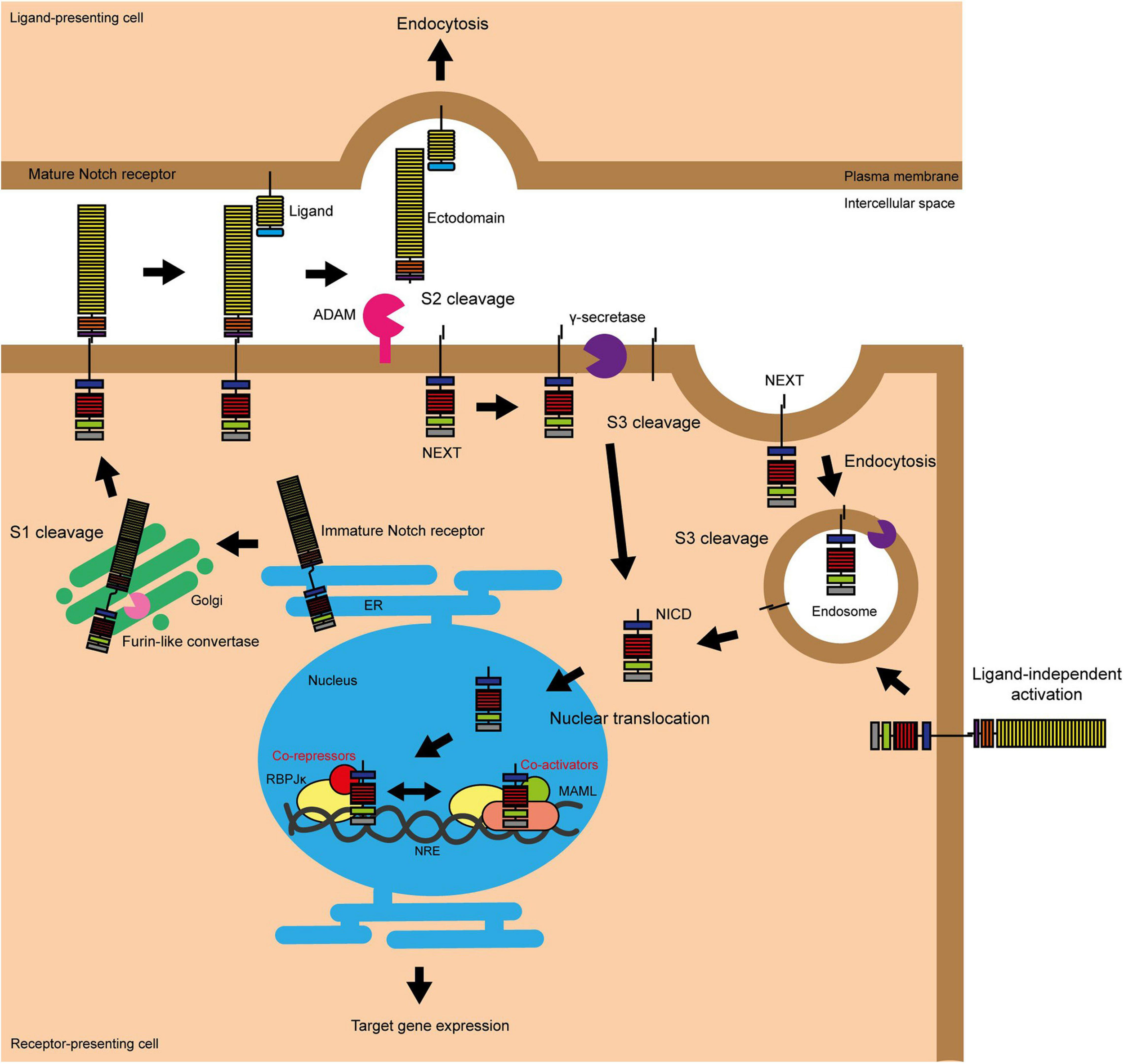 Figure 1. Activation of Notch signalling. The Notch pathway can be activated in two ways, either by interacting with a ligand on an adjacent cell or following endocytosis driven by Deltex. S1 cleavage occurs in the Golgi and mediates the production of the mature Notch heterodimer which is presented on the surface of the cell. Ligand binding stimulates S2 cleavage, which causes the release of the Notch ectodomain and subsequent endocytosis by the ligand-presenting cell. S2 cleavage provides the substrate for γ-secretase, which carries out the final S3 cleavage and releases NICD into the cytoplasm where it can translocate into the nucleus to activate target gene transcription (Fortini, 2009; Aster et al., 2017). The endocytosis of the Notch protein to the multivesicular body driven by Deltex also provides a substrate for γ-secretase and thus target gene transcription (Steinbuck and Winandy, 2018).