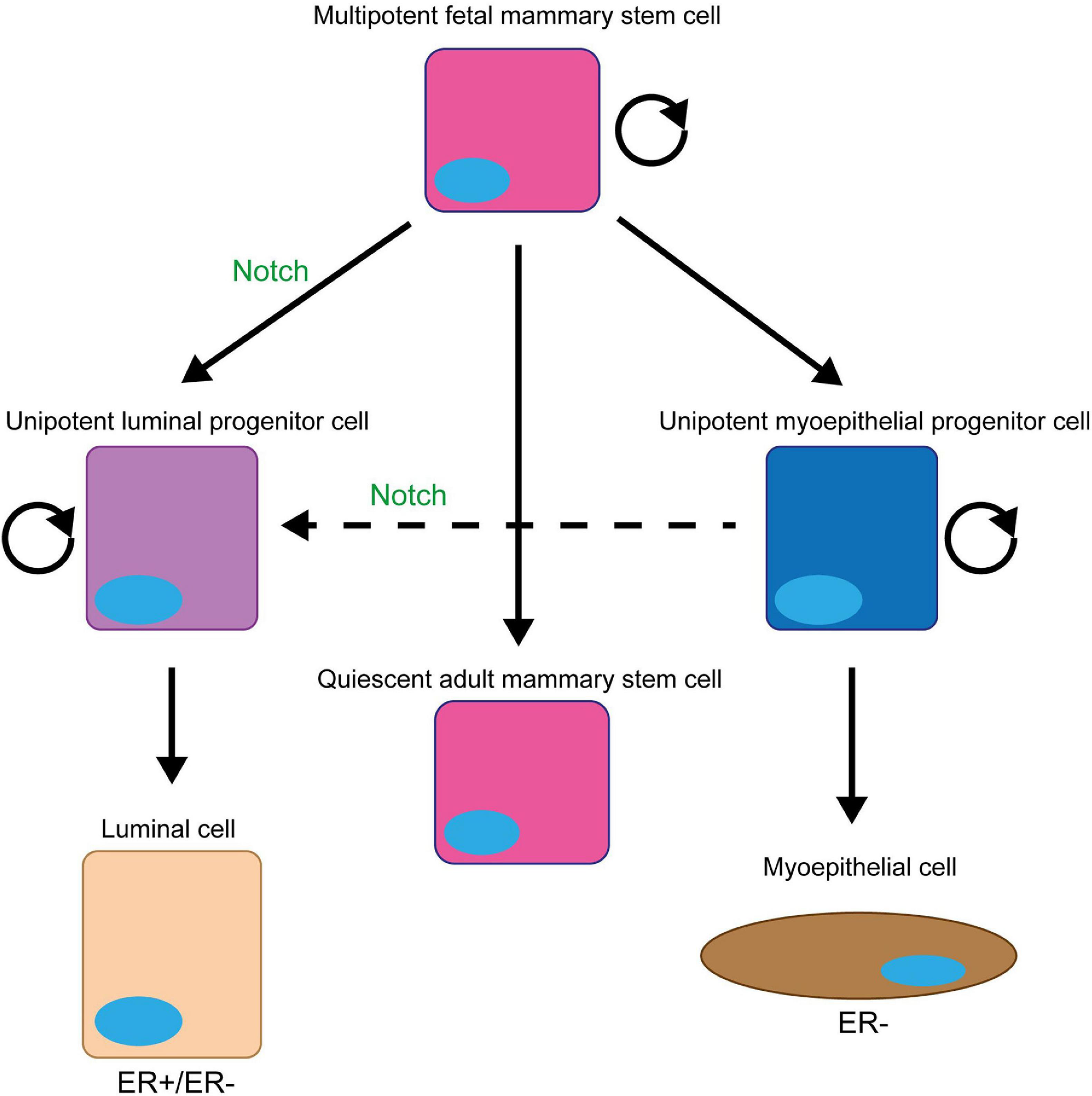 On the other hand, there is abundant evidence that Notch signalling plays a significant role in driving MaSCs toward the unipotent luminal progenitor fate. Notch1–3 are more highly expressed in luminal cells, whilst the Notch pathway inhibitors Numb and Numb-like are found in myoepithelial cells (Bouras et al., 2008; Raouf et al., 2008; Raafat et al., 2011; Zhang Y. et al., 2016). Functional studies using knockout and transgenic mouse models and primary human cells have confirmed that Notch signalling controls the luminal vs. myoepithelial lineage balance (Smith et al., 1995; Dontu et al., 2004; Kiaris et al., 2004; Buono et al., 2006; Hu et al., 2006; Bouras et al., 2008; Raouf et al., 2008; Yalcin-Ozuysal et al., 2010; Santoro et al., 2016; Zhang Y. et al., 2016; Onoyama et al., 2020). In the absence of Notch signalling, there is an accumulation of myoepithelial cells, whilst increased Notch signalling leads to an expansion of the of the luminal lineage (Smith et al., 1995; Kiaris et al., 2004; Buono et al., 2006; Hu et al., 2006; Bouras et al., 2008; Yalcin-Ozuysal et al., 2010; Zhang Y. et al., 2016; Onoyama et al., 2020). Lineage tracing studies have found that Notch signalling drives MaSCs into the unipotent luminal progenitor fate by late embryogenesis (Lafkas et al., 2013; Šale et al., 2013; Rodilla et al., 2015; Lilja et al., 2018). However, recent experiments have shown that following ablation of luminal cells, Notch signalling is reactivated in unipotent myoepithelial progenitors to drive the regeneration of luminal cells (Centonze et al., 2020). Interestingly, the functional studies have also shown that Notch signalling not only drives MaSCs toward the luminal progenitor cell fate but also maintains cells in this fate preventing their terminal differentiation (Dontu et al., 2004; Buono et al., 2006; Bouras et al., 2008; Raouf et al., 2008; Zhang Y. et al., 2016). Maintaining this proliferative cell fate could explain why tumour development is seen in transgenic and knockout mouse models where Notch signalling is activated in the mammary gland (Smith et al., 1995; Kiaris et al., 2004; Hu et al., 2006).