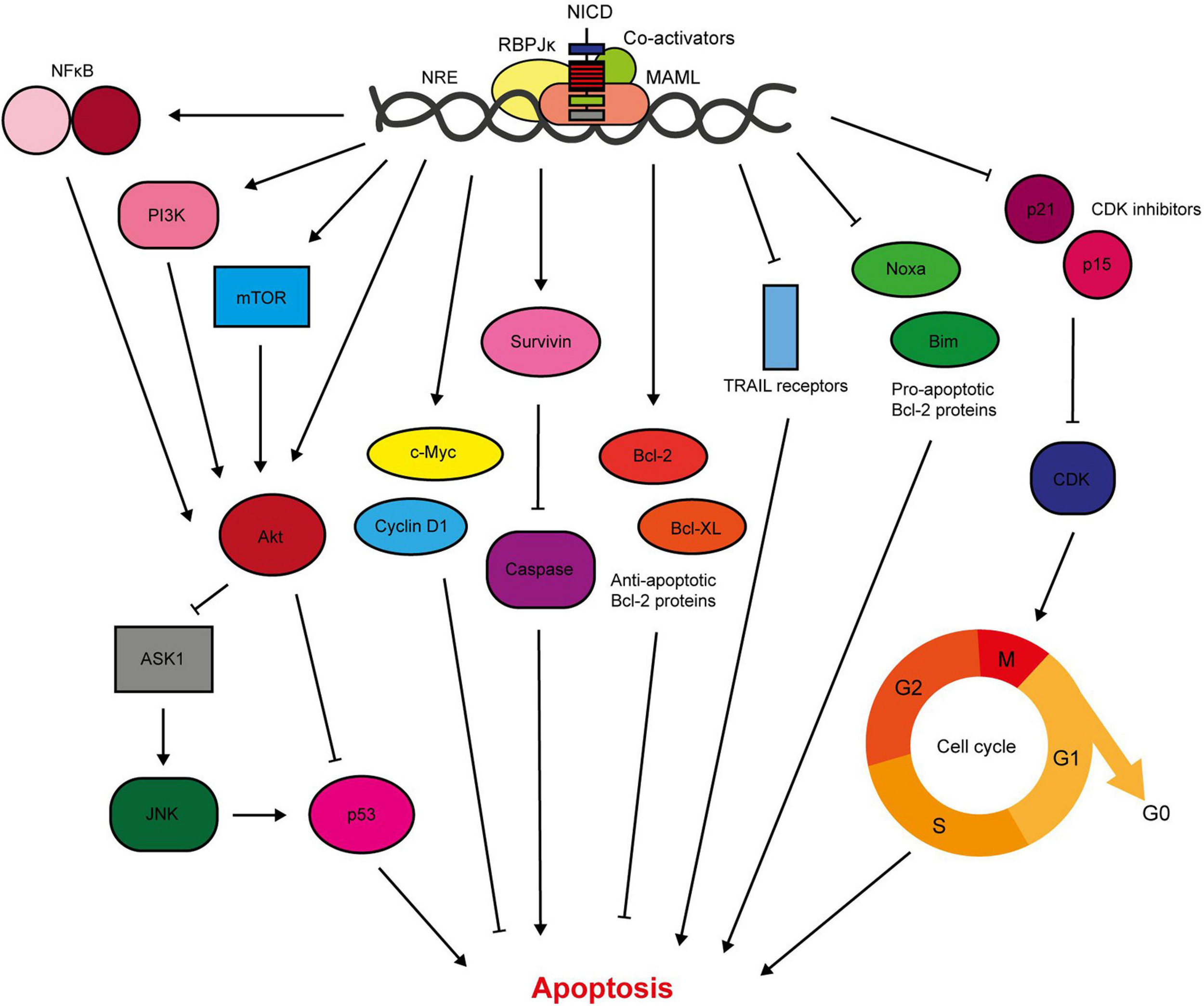 Figure 4. Notch signalling inhibits breast cancer cell apoptosis. Notch activates pro-survival Akt signalling through NFκB, PI3K, and mTOR signalling (Mungamuri et al., 2006; Osipo et al., 2008a; Efferson et al., 2010; Zang et al., 2010; Zhu et al., 2013; Li L. et al., 2014b; Hossain et al., 2018). Our lab have shown that Notch also stimulates Akt through a secreted factor, which triggers stabilisation of p53 through ASK1/JNK signalling (Meurette et al., 2009). The Notch target gene c-Myc is anti-apoptotic, and there is significant evidence demonstrating upregulation of survivin in response to Notch activation (Klinakis et al., 2006; Lee et al., 2008a, b). Survivin prevents apoptosis through indirect and direct caspase inhibition (Garg et al., 2016). Of the Bcl-2 family members, Notch upregulates the anti-apoptotic members including Bcl-2 and Bcl-XL, while downregulating pro-apoptotic members such as Bim and Noxa (Portanova et al., 2013; Sales-Dias et al., 2019). Active Notch signalling reduces the sensitivity of TNBC cells to TRAIL-induced apoptosis (Portanova et al., 2013). Notch regulation of cell cycle regulators, including cyclin D1, p21 and p15, also contributes to apoptosis resistance (Cohen et al., 2010; Sales-Dias et al., 2019).