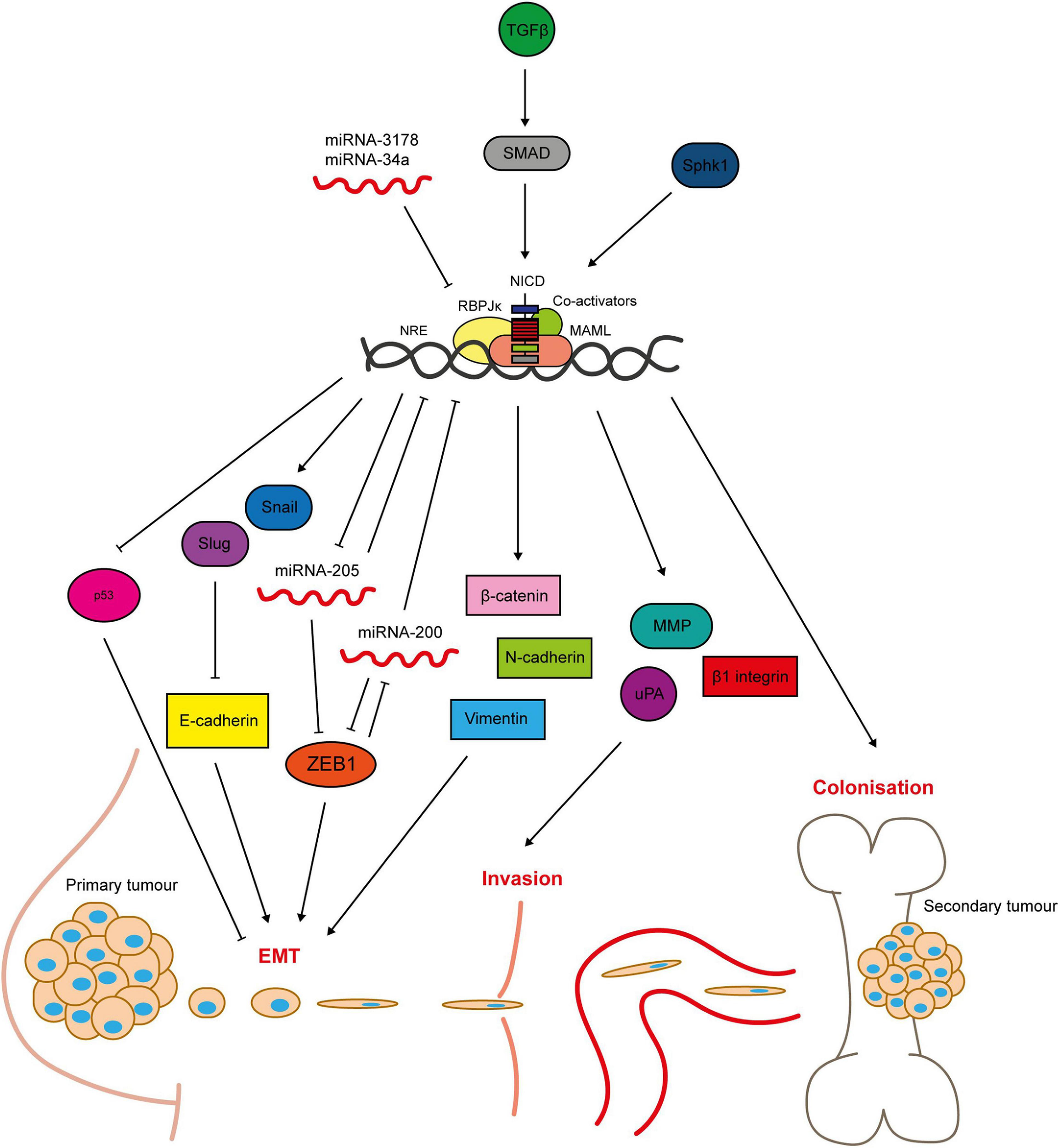 Figure 5. Notch signalling regulates breast cancer cell metastasis. Notch-mediated metastasis is induced by factors such as TGFβ and Sphk1 (Zavadil et al., 2004; Zhang et al., 2010; Sethi et al., 2011; Wang S. et al., 2018b). Notch activates key regulators of EMT including the transcriptional repressors Slug and Snail, that mediate loss of cell-cell contacts through inhibition of E-cadherin expression (Leong et al., 2007; Sahlgren et al., 2008; Zhang et al., 2010; Du et al., 2012; Shao et al., 2015; Kong et al., 2018). The mesenchymal markers ZEB1, β-catenin, N-cadherin and vimentin are upregulated by Notch signalling (Bolós et al., 2013; Lai et al., 2018). ZEB1 is activated through complex bi-directional signalling involving micro-RNAs (Brabletz et al., 2011). Micro-RNAs negatively regulate Notch signalling, and their loss is sufficient to induce EMT in breast epithelial cells (Du et al., 2012; Chao et al., 2014; Kong et al., 2018). Notch is also implicated in tissue invasion, as it upregulates matrix-degrading enzymes including MMP2 and 9 and urokinase-type plasminogen activator (uPA), as well as β1-integrin (Shimizu et al., 2011; Lai et al., 2018). Anti-apoptotic Notch signalling (see Figure 4) enables the cells to survive in the blood stream and travel to secondary sites. Notch signalling between the cancer cells and cells in the bone microenvironment facilitates colonisation and growth at the metastatic site (Sethi et al., 2011).