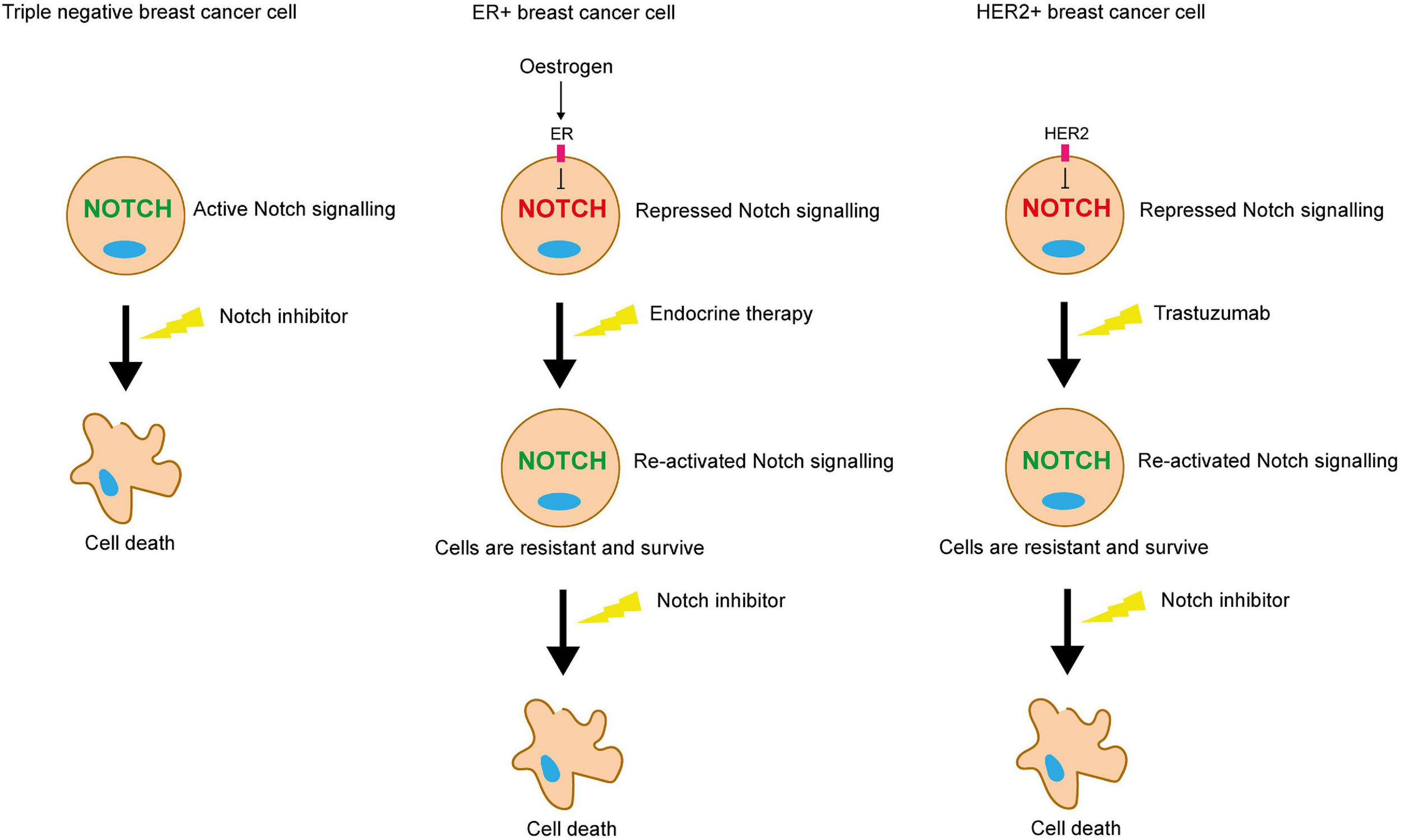 Figure 7. Notch inhibition may be a viable strategy for targeting therapy resistant breast cancer cells. ER and HER2 signalling inhibits Notch in ER+ and HER2+ breast cancer cells respectively. Endocrine or trastuzumab treatment inhibit these pathways, releasing the blockade on Notch signalling. Pro-survival Notch activity enables the cells to survive the targeted treatments. Notch inhibitors could be used in combination to sensitise these resistant cells to the targeted treatment. Triple negative breast cancer cells lack the ER and HER2 receptors, meaning that they are unaffected by endocrine therapy or trastuzumab, but are sensitive to Notch inhibitors.
