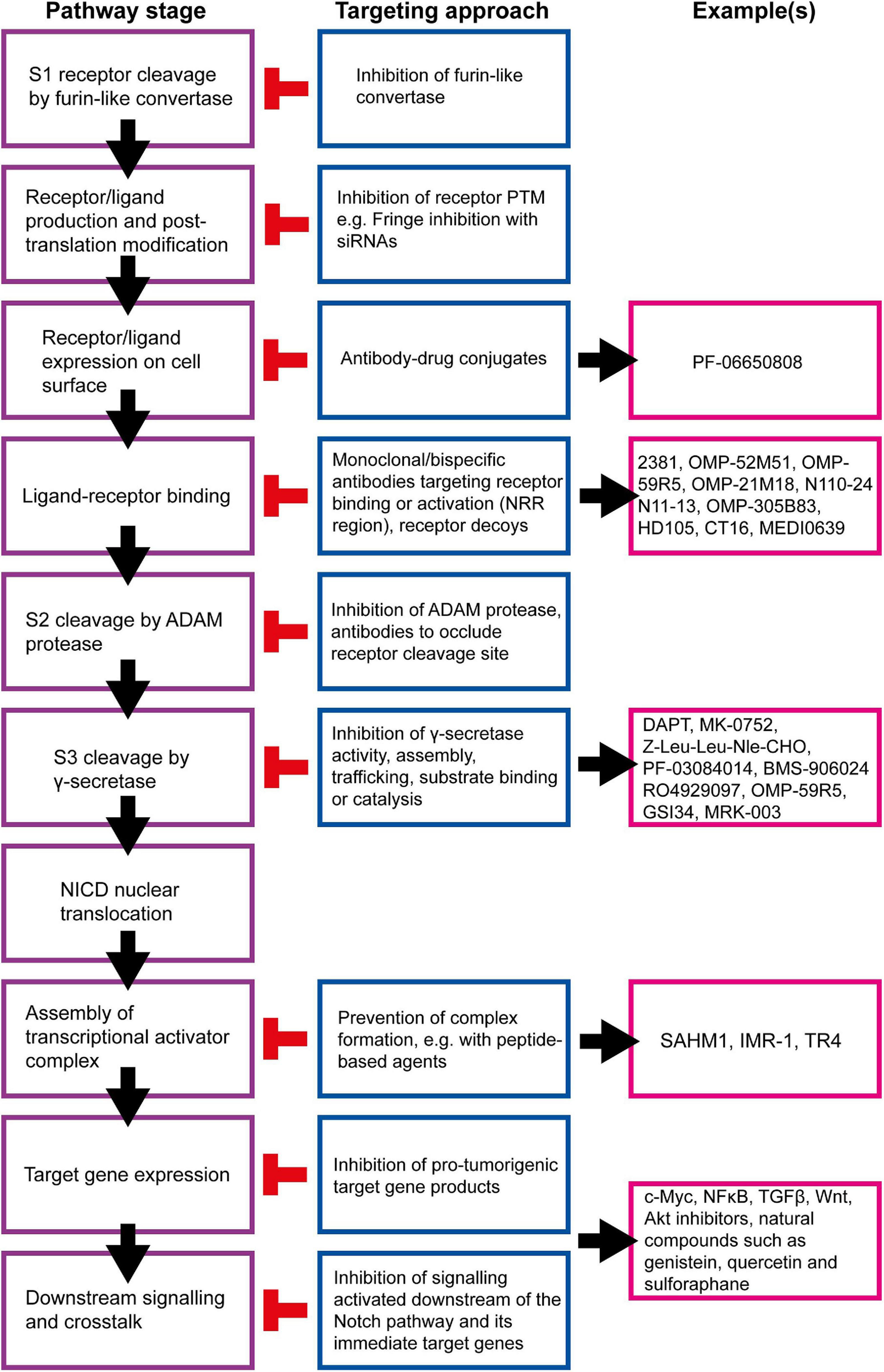 Figure 8. Summary of targetable points of the Notch pathway. The Notch signalling pathway can be inhibited at almost all stages, and a number of strategies are being developed to target these steps for therapeutic purposes (Andersson and Lendahl, 2014). γ-secretase inhibitors (GSIs) are the most well-established Notch inhibitors. Most competitively inhibit presenilin in the γ-secretase complex, and are hence pan Notch inhibitors that prevent all signalling events downstream of the Notch receptor regardless of receptor isoform or activating ligand (Krishna et al., 2019). The γ-secretase complex can also be targeted with monoclonal antibodies raised against presenilin or nicastrin (Hayashi et al., 2012; Takagi-Niidome et al., 2013; Zhang et al., 2014). Other pan Notch inhibitors include those that target the NICD/RBPJκ/MAML transcriptional activator complex. SAHM1 is a synthetic hydrocarbon-stapled α-helical peptide designed to mimic a portion of the N terminus of MAML. It competitively binds NICD/RBPJκ, preventing MAML binding (Moellering et al., 2009). Ligand-receptor binding is a popular target for current Notch inhibitor development. This can be achieved through receptor decoys, monoclonal antibodies, bispecific antibodies and antibody-drug conjugates (Noguera-Troise et al., 2006; Li L. et al., 2008; Hoey et al., 2009; Wu et al., 2010; Sharma et al., 2012; Li D. et al., 2014; Kangsamaksin et al., 2015; ClinicalTrials.gov., 2016, 2019a; Hidalgo et al., 2016; Lee et al., 2016; Cubillo Gracian et al., 2017; Hu et al., 2017; Lamy et al., 2017; Zheng et al., 2017; Hughes et al., 2018; Giuli et al., 2019; Jimeno et al., 2019; Smith et al., 2019; Rosen et al., 2020). Various natural compounds (and their derivatives) have been found to inhibit Notch signalling (Kawahara et al., 2009; Kallifatidis et al., 2011; Li Y. et al., 2012b; Pan et al., 2012; Xia et al., 2012; Nwaeburu et al., 2016; Sha et al., 2016; Mori et al., 2017; Castro et al., 2019; Li et al., 2020). These hold potential to be adapted and appropriated into cancer therapy.