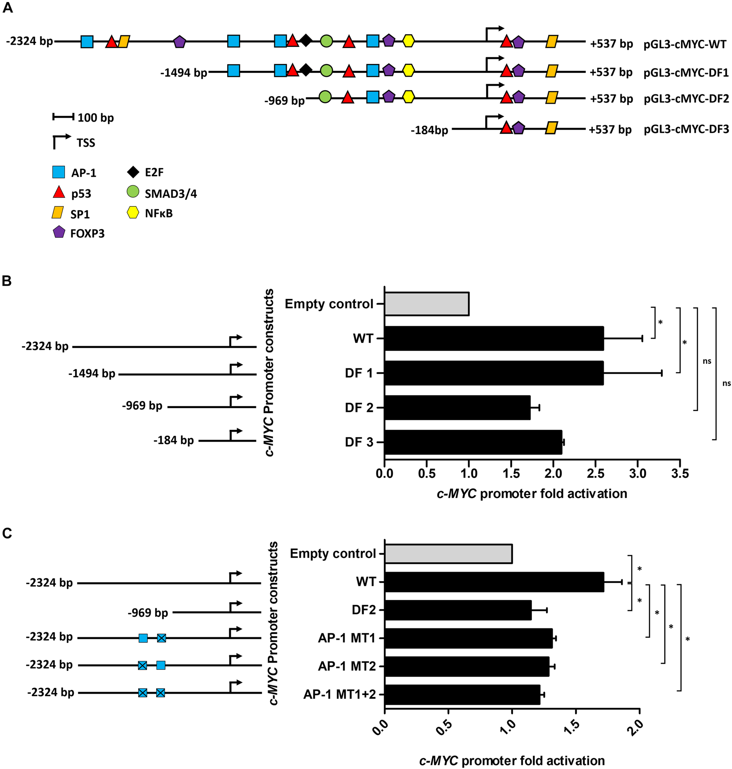 The AP-1 sites located at positions -1128 and -1375 bp partially mediate the effect of HIV-1 Tat on the c-MYC promoter. (A) The WT c-MYC promoter (-2324 to + 537 bp) construct was analyzed for TFBS using PROMO. Sites are represented as different colored shapes which are labeled in the key and the transcription start site (TSS) is denoted by a black arrow. Shortened promoter constructs are labeled accordingly on the right side of the diagram (pGL3-cMYC-DF1, pGL3-cMYC-DF2 and pGL3-cMYC-DF3). (B) Luciferase reporter assays comparing the fold activation of the c-MYC WT promoter to the deletion constructs (DF1-DF3) in the presence of HIV-1 Tat. (C) Luciferase assays comparing fold activation in the presence of HIV-1 Tat between the WT promoter, DF2 and AP-1 MT1, AP-1 MT2 and AP-1 MT1 + 2 constructs. Fold activation was obtained by comparing the relative luciferase units (RLU) of the pcDNA-Tat transfected groups to their empty transfected controls, which were set to 1. Statistical analysis was done using one-way ANOVA in GraphPad PRISM 8. Significance (p < 0.05) and ns (not significant). Error bars represent SD. The results are representative of at least three separate repeats.