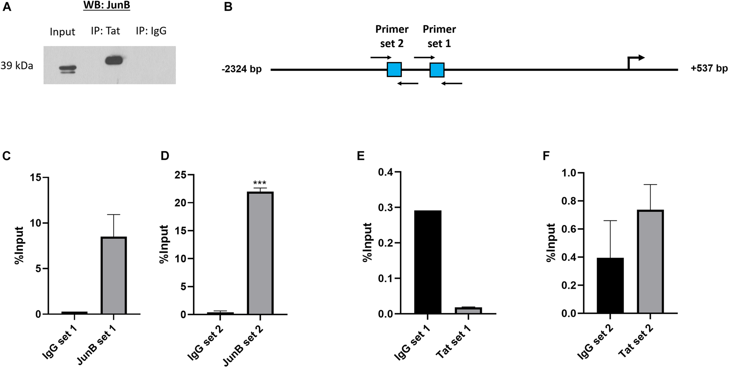 Previous studies have shown that HIV-1 Tat can form complexes with cellular proteins including transcription factors. For instance, Tat was found to form a complex with NFAT and c-Jun at an NFAT/AP-1 composite site (Hidalgo-Estévez et al., 2006). There is evidence that Tat can alter cellular gene expression both through direct binding of promoters, as well as through complexing with transcription factors (Lim and Garzino-Demo, 2000; Carvallo et al., 2017). Using an in vitro co-immunoprecipitation assay we found that Tat can form a complex with the AP-1 factor JunB, which is a major component of AP-1 complexes, and previously reported to associate with Tat (Kumar et al., 1998; Hidalgo-Estévez et al., 2006; van der Sluis et al., 2014). Using an HIV-1 Tat specific antibody, protein complexes were pulled down in Tat-expressing cells and subjected to western blotting using an antibody specific to JunB and the result shows that JunB and Tat co-exist within a protein complex (Figure 3A). The reverse experiment, i.e., pull-down using an antibody specific to JunB could not be achieved because the antibody is not compatible with IP assays (data not shown). Nevertheless, we found confidence in this result by the fact that two independent anti-Tat antibodies were able to successfully pull down JunB in separate assays. Further confirmatory evidence of the Tat/JunB/c-MYC axis was obtained using in vivo chromatin-immunoprecipitation (ChIP) assays, using two primer sets that spanned AP-1 sites 1 and 2 (Figure 3B). The results showed that both AP-1 sites were enriched when chromatin was pulled down with JunB antibodies (Figures 3C,D), with a significantly pronounced enrichment at AP-1 site 2 (Figure 3D). Pull down with HIV-1 Tat antibodies showed no enrichment at site 1 (Figure 3E), while enrichment was found at site 2, albeit lower levels, and although not statistically significant, this result was reproducible (Figure 3F). These results indicate that HIV-1 Tat and the AP-1 factor JunB exist within a protein complex that binds with c-MYC promoter at AP-1 binding elements.