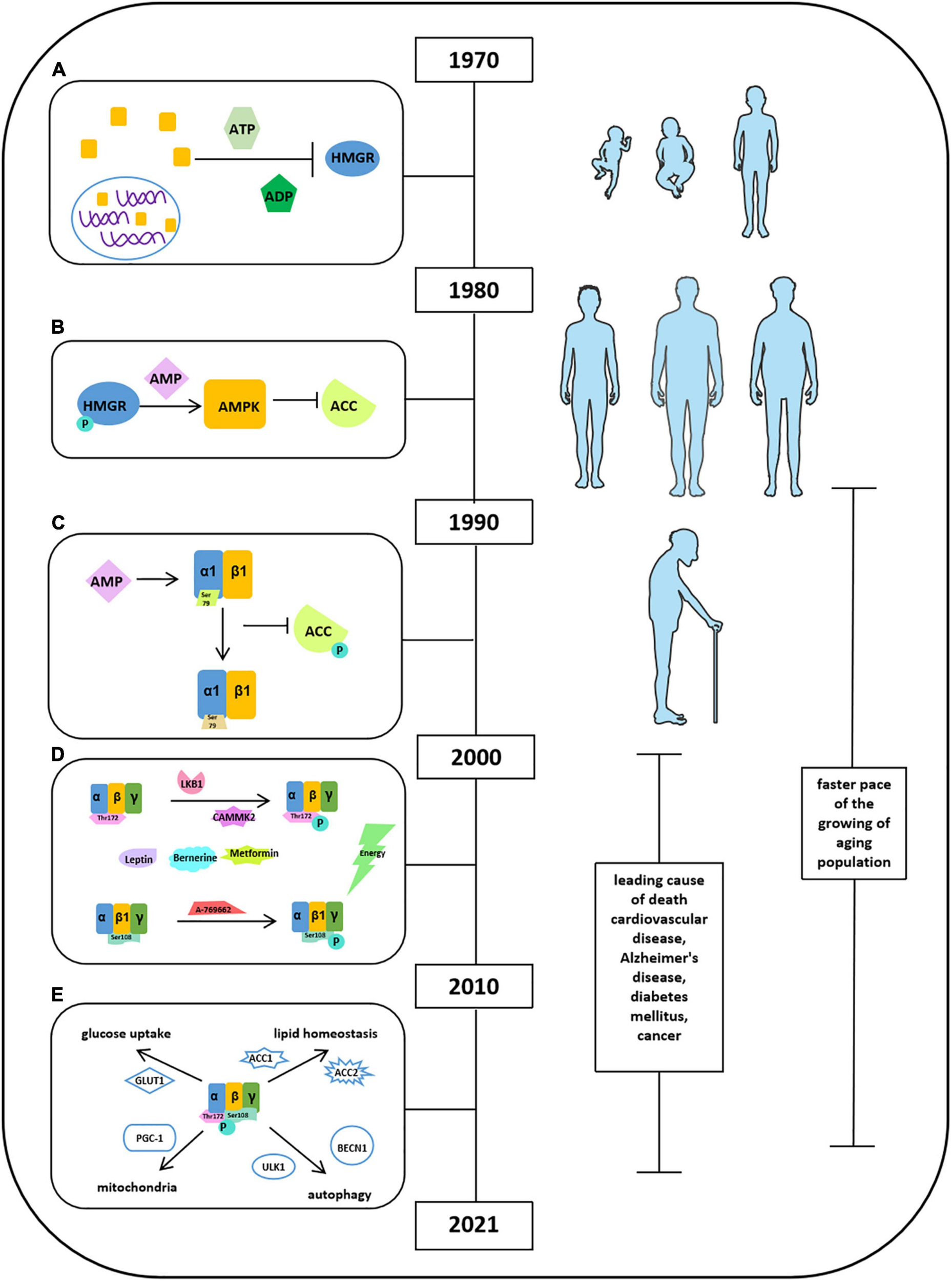 Figure 1. Milestones of discoveries of AMPK protein. (A) Cytosolic factor could inactivate 3-hydroxy-3-methyl-glutaryl-coenzyme A reductase (HMGR) in the presence of ATP and ADP. (B) ACC and HMGR could be purified separately, and the ACC and HMGR are regulated by AMP. (C) The structure of AMPK comprised an α1 catalytic subunit with a functional domain and a β1 subunit. AMPK is allosterically activated by AMP to phosphorylate and inactivate ACC at Ser79. (D) Factors reported to stimulate AMPK activation. (E) Activities of AMPK in glucose uptake, lipid homeostasis, autophagy, and mitochondria.