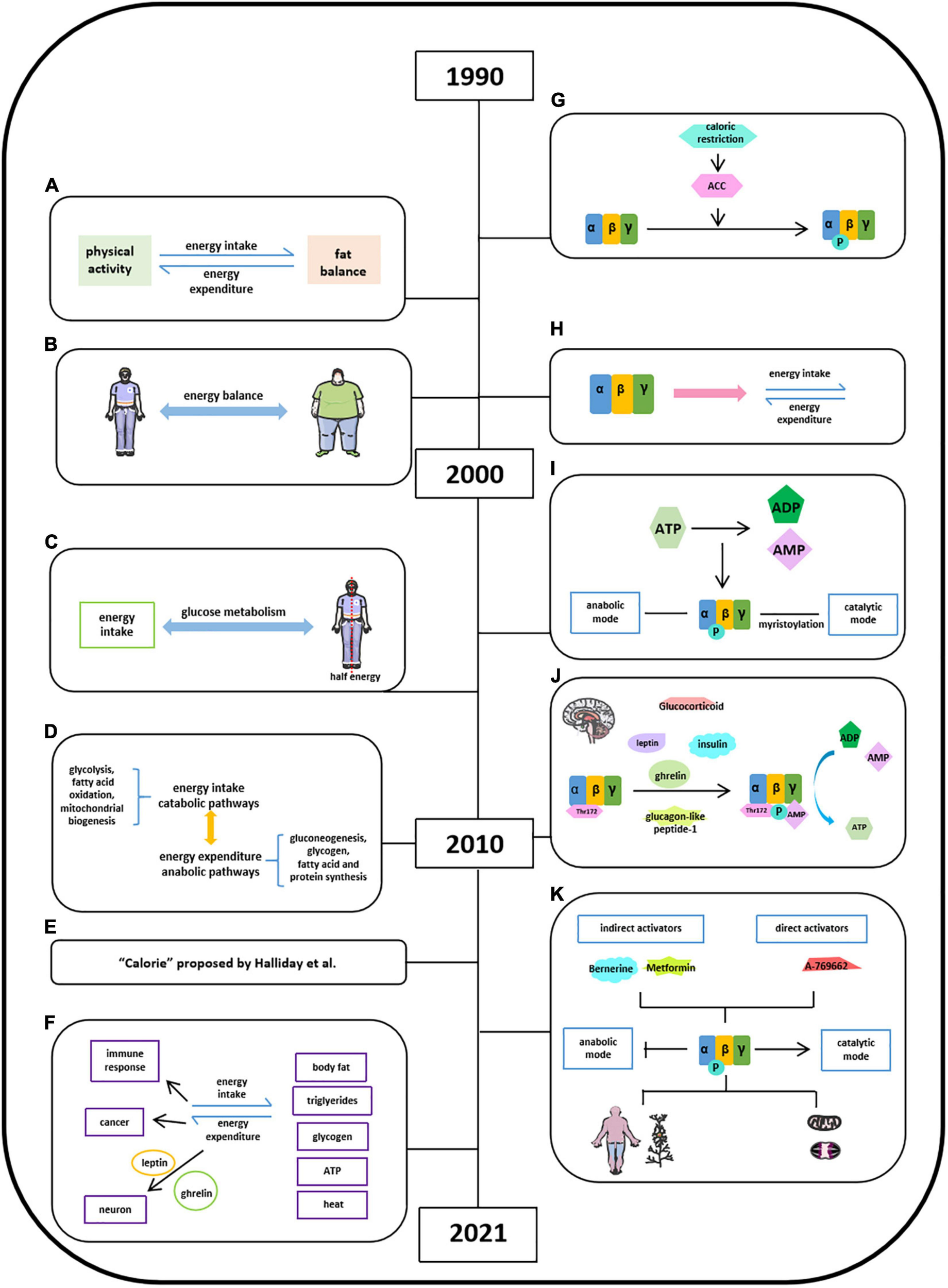 Figure 2. Milestones of discoveries of energy balance and the role of AMPK in energy balance. (A) Concept of energy balance. (B) Well-balanced energy is critical in maintaining a stable body weight. (C) Half of the body energy was obtained from glucose metabolism after energy intake. (D) Concept of energy intake (catabolic pathways) and energy expenditure (anabolic pathways). (E) The quantification of energy was measured by the unit “calorie” proposed by Halliday et al. (2011). (F) Format of energy store and energy balance involved activities. (G) AMPK is activated via inducing ACC by calorie restriction. (H) AMPK protein structure has been studied in energy balance. (I), Energy imbalance between anabolic and catabolic process in some metabolic syndromes is due to ATP consumption. (J) Factors reported to stimulate AMPK activation in hypothalamus. (K) AMPK may act as the key regulator in energy balance in a specific organ or tissue.