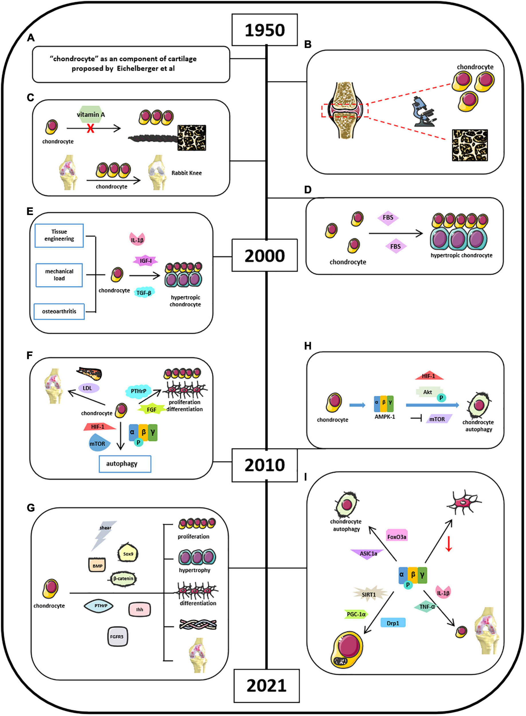 Figure 3. Milestones of discoveries of chondrocytes and the role of AMPK in cartilage chondrocytes. (A) Eichelberger et al. (1951) proposed “chondrocyte” as a component of cartilage. (B) Godman and Porter applied electron microscope to reveal the evolution of chondrogenesis. (C) Vitamin A could inhibit chondrogenesis and limiting extracellular space. (D) Cell density and FBS concentrations determine the transitional fate of resting chondrocytes to proliferative and hypertrophic chondrocyte. (E) Understanding of chondrocytes associated with osteoarthritis and upstream mediators in regulating chondrocyte activities. (F) Factors involved in cartilage chondrocytes’ homeostasis by 2010. (G) Current signaling pathways mediate chondrocyte activities. (H) Mouse chondrocytes expressed energy sensor AMPK-1, which promotes chondrocyte autophagy associated with Akt activation, mTOR suppression, and HIF-1 expression. (I) Current AMPK-related signaling pathways in mediating chondrocyte homeostasis.
