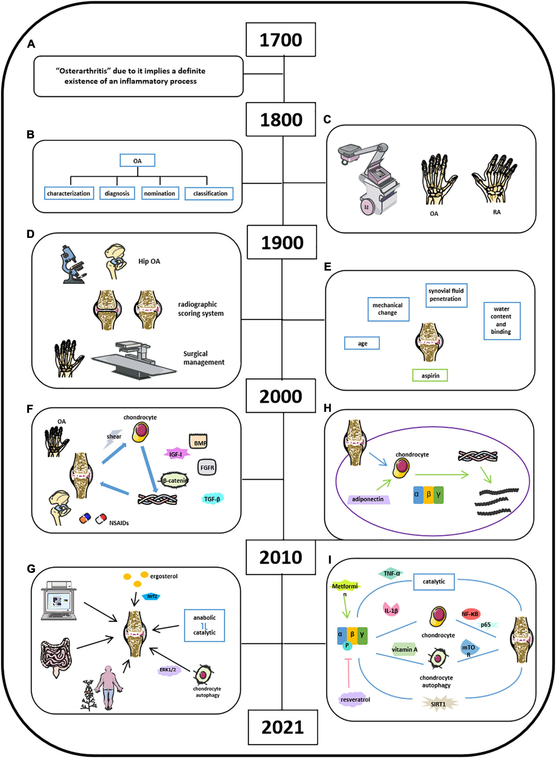 Figure 4. Milestones of discoveries of osteoarthritis and the role of AMPK in cartilage regeneration. (A) Physicians recognize the inflammatory process of OA by 18th century. (B) In 19th century, the knowledge of clinical OA became comprehensive. (C) X-rays applied in clinics helped Goldthwait distinguish OA from rheumatic arthritis (RA). (D) In 1900s, light microscope and electron microscope helped physicians in knee and hip OA treatment. (E) Knowledge of OA related in age, mechanical change, synovial fluid penetration, and water content binging. (F) NSAIDs and some herbal medicines were used to treat OA or relieve OA-related pain; activation of cartilage anabolic factors was associated with the degradation of proteoglycans, collagen type II, and cleaving matrix metalloproteinase. (G) Comprehensive understanding of OA by 2021. (H) Adiponectin mediates matrix degradation in human OA chondrocytes via AMPK and JNK pathways. (I) Molecules involved in OA homeostasis.