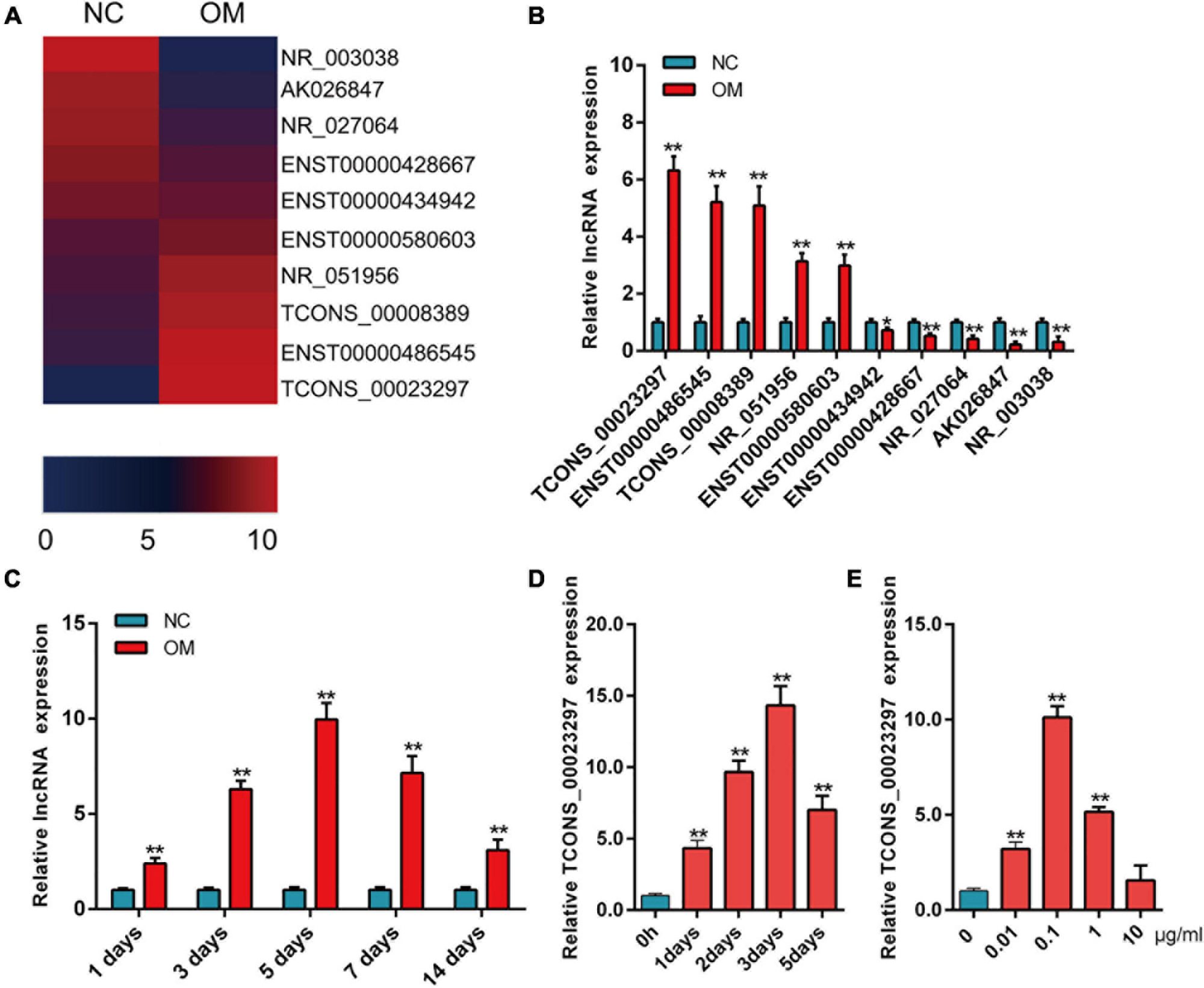 Expression of TCONS_00023297 improved during osteogenesis. (A) The expression of lncRNA was analyzed by hotmap, NC was indicated negative control and OM was indicated osteogenic medium. (B) Detection of lncRNA expression in osteogenic differentiation by qRT-PCR. (C) Expression of TCONS_00023297 in the osteogenic differentiation of hBMSCs detected by qRT-PCR. (D) Effect of BMP-2 on the expression of TCONS_00023297 at different time points. (E) Effects of different concentrations of BMP-2 on the expression of TCONS_00023297. All data are expressed as the means ± standard deviations. “*”means P < 0.05, and “**”means P < 0.01.