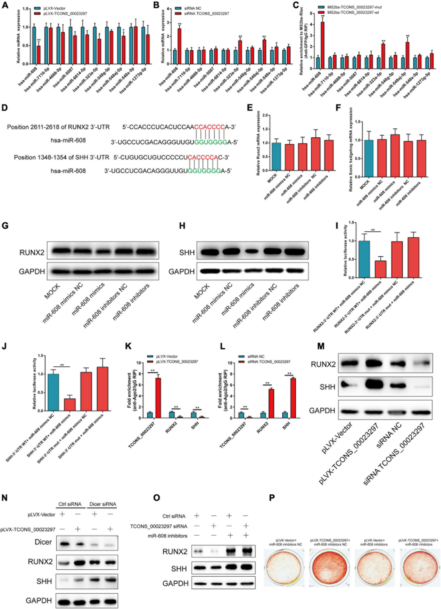 TCONS_00023297 promotes the osteogenesis of BMSCs by regulating miR-608/RUNX2/SHH. (A) qRT-PCR was used to detect the effect of TCONS_00023297 overexpression on miRNA expression. (B) qRT-PCR was used to detect the effect of TCONS_00023297 knockdown on miRNA expression. (C) MS2bs RNA pulldown assay detected miRNAs combined with TCONS_00023297. (D) TargetScan bioinformatics software predicted the binding sites of miR-608 and the RUNX2/SHH 3′-UTR. (E) qRT-PCR detected the effect of miR-608 on the expression level of RUNX2 mRNA. (F) qRT-PCR detected the effect of miR-608 on the expression level of SHH mRNA. (G) Western blot analysis of the expression of miR-608 at the RUNX2 protein level. (H) Western blot analysis of the expression of miR-608 at the SHH protein level. (I) Luciferase reporter gene verification of the combination of miR-608 and RUNX2-3′-UTR. (J) Luciferase reporter gene verification of the combination of miR-608 and SHH-3′-UTR. (K) Ago2 pulldown detection of TCONS_00023297 overexpression and Ago2 binding. (L) Ago2 pulldown assay detected the binding of TCONS_00023297 knockdown and Ago2. (M) Western blot analysis was used to detect the effect of TCONS_00023297 on the protein expression of RUNX2 and SHH. (N) TCONS_00023297 affected the expression of RUNX2 and SHH protein after Dicer knockdown. (O) Effect of TCONS_00023297 on the expression of RUNX2 and SHH protein after miR-608 inhibition. (P) Alizarin red staining was used to detect the effect of TCONS_00023297 on the osteogenic differentiation of hBMSCs after miR-608 inhibition. All data are expressed as the means ± standard deviations. “*”means P < 0.05, and “**”means P < 0.01.