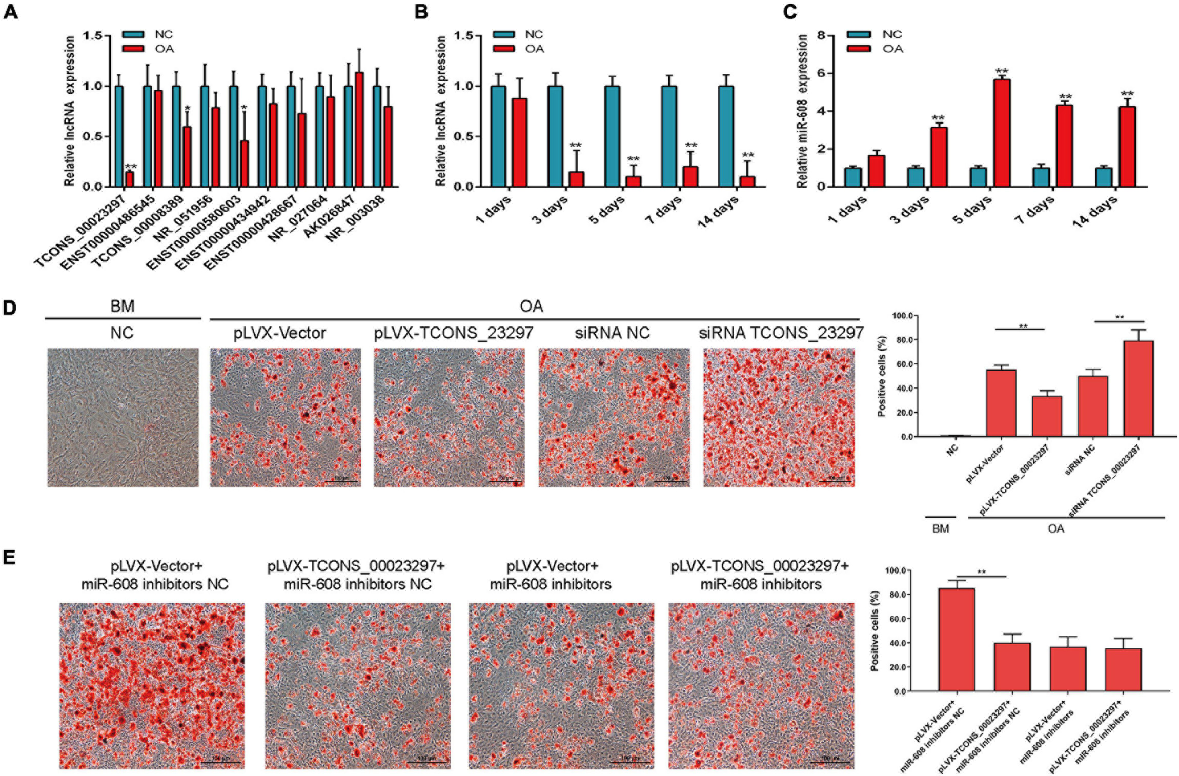 In the process of osteoporosis, the ability of hBMSCs to differentiate into osteoblasts is weakened, and the ability to differentiate into fats is enhanced. Therefore, we used qRT-PCR to verify the expression changes of lncRNAs on the third day of induction of adipogenic differentiation. The qRT-PCR results showed that lncRNAs were significantly different on the third day of adipogenic differentiation, and TCONS_00023297, TCONS_00008389, and ENST00000580603 were significantly decreased on the third day of adipogenic differentiation (Figure 4A). qRT-PCR detection found that TCONS_00023297 was significantly reduced on the third day of hBMSC adipogenic differentiation. Therefore, we further used qRT-PCR to detect the expression changes of TCONS_00023297 on days 1, 3, 5, 7, and 14 of adipogenic differentiation. The test results showed that the expression of TCONS_00023297 on the third, fifth, seventh, and 14th days of adipogenic differentiation induction was significantly lower than that of the control group (Figure 4B). qRT-PCR was used to detect the expression changes of miR-608 on days 1, 3, 5, 7, and 14 of adipogenic differentiation. The test results showed that the expression of miR-608 was significantly higher than that of the control group on days 3, 5, 7, and 14 of adipogenic differentiation (Figure 4C). After adipogenic differentiation on the 14th day, oil red O staining was used to detect that the overexpression of TCONS_00023297 could inhibit the adipogenic differentiation of hBMSCs, and inhibition of the expression of TCONS_00023297 could promote the adipogenic differentiation of hBMSCs (Figure 4D). To further verify that the effect of TCONS_00023297 on the adipogenic differentiation of hBMSCs is mediated by miR-608, we used miR-608 inhibitors to inhibit the function of miR-608 in hBMSCs and then overexpressed TCONS_00023297 to detect the osteogenic differentiation function of hBMSCs. The results of oil red O staining showed that the overexpression of TCONS_00023297 could inhibit the adipogenic differentiation of hBMSCs when miR-608 functioned normally. When miR-608 inhibitors were used to inhibit the function of miR-608 in hBMSCs, the effect of TCONS_00023297 overexpression on the adipogenic differentiation function of hBMSCs was weakened (Figure 4E).