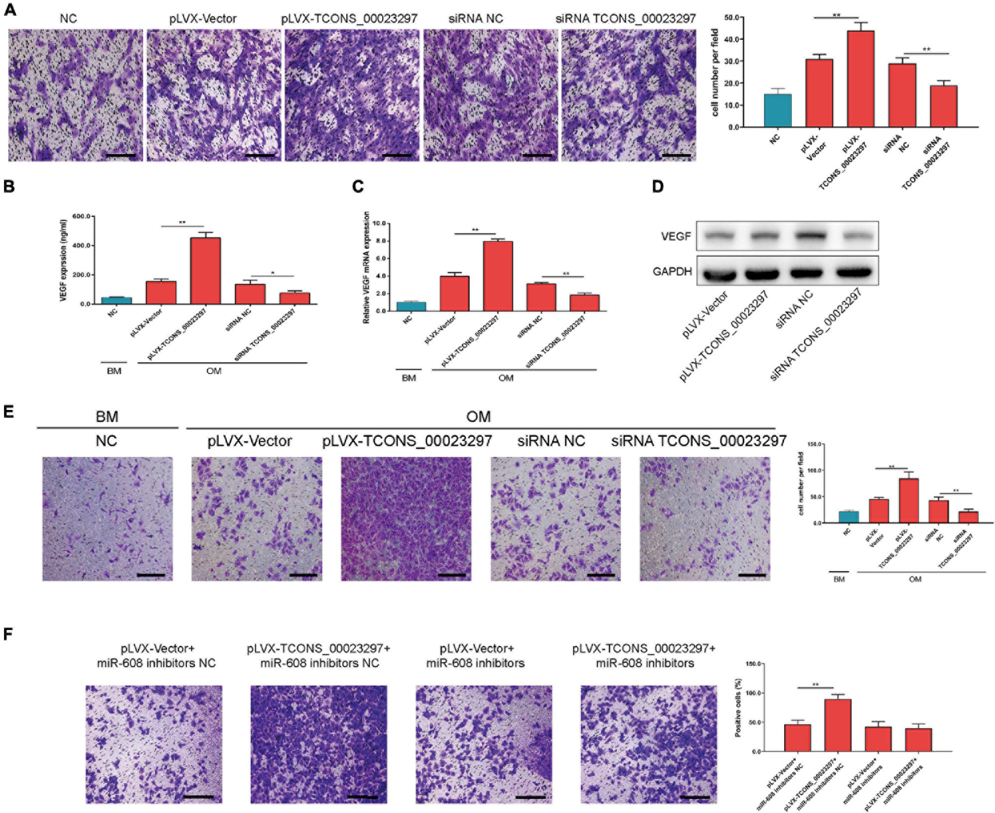 LncRNA TCONS_00023297 regulates the angiogenesis–osteogenesis coupling process. (A) Quantitative analysis of the effect of TCONS_00023297 on the migration of hBMSCs. Scale bar 100 μm. (B) ELISA detected the expression of VEGF in the hBMSC culture supernatant. (C) Real-time fluorescent quantitative PCR detected the expression of VEGF mRNA in hBMSCs. (D) Western blot detected the expression of VEGF in hBMSCs. (E) Transwell assays were used to detect the effect of TCONS_00023297 on HUVEC migration and with quantitative analysis. Scale bar 100 μm. (F) Transwell assays were used to detect the effect of TCONS_00023297 on HUVEC migration after miR-608 knockdown and with quantitative analysis. Scale bar 100 μm. All data are expressed as the means ± standard deviations. “*”means P < 0.05, and “**”means P < 0.01.