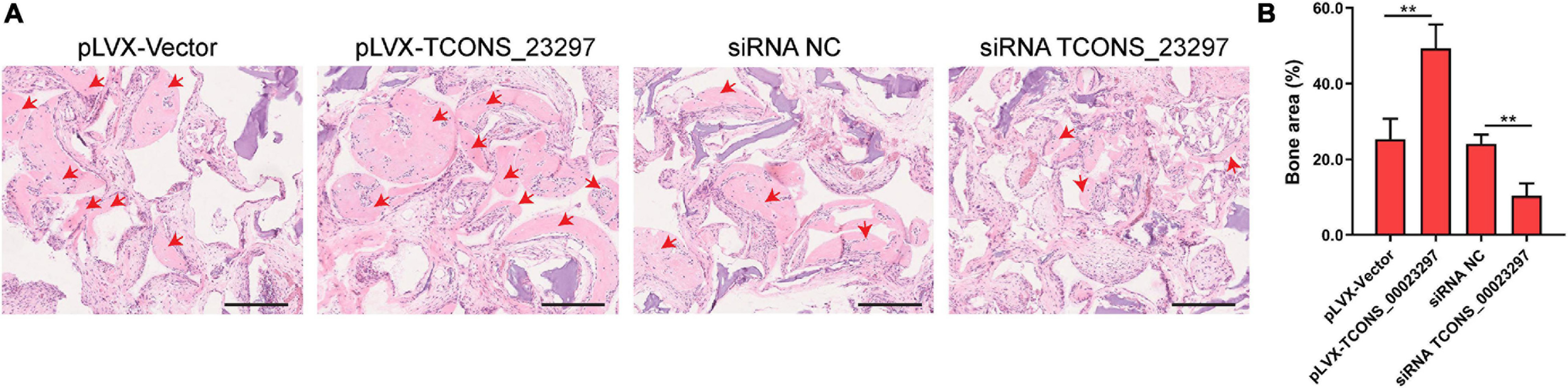 LncRNA TCONS_00023297 regulates osteogenesis in vivo. (A) H&E staining was used to detect new bone formation. The area indicated by the red arrow was new bone. Scale bar 200 μm (B) Quantitative analysis of new bone formation. “**”means P < 0.01.